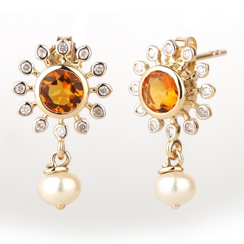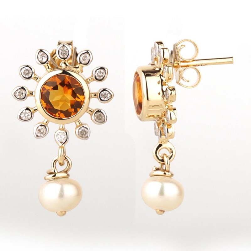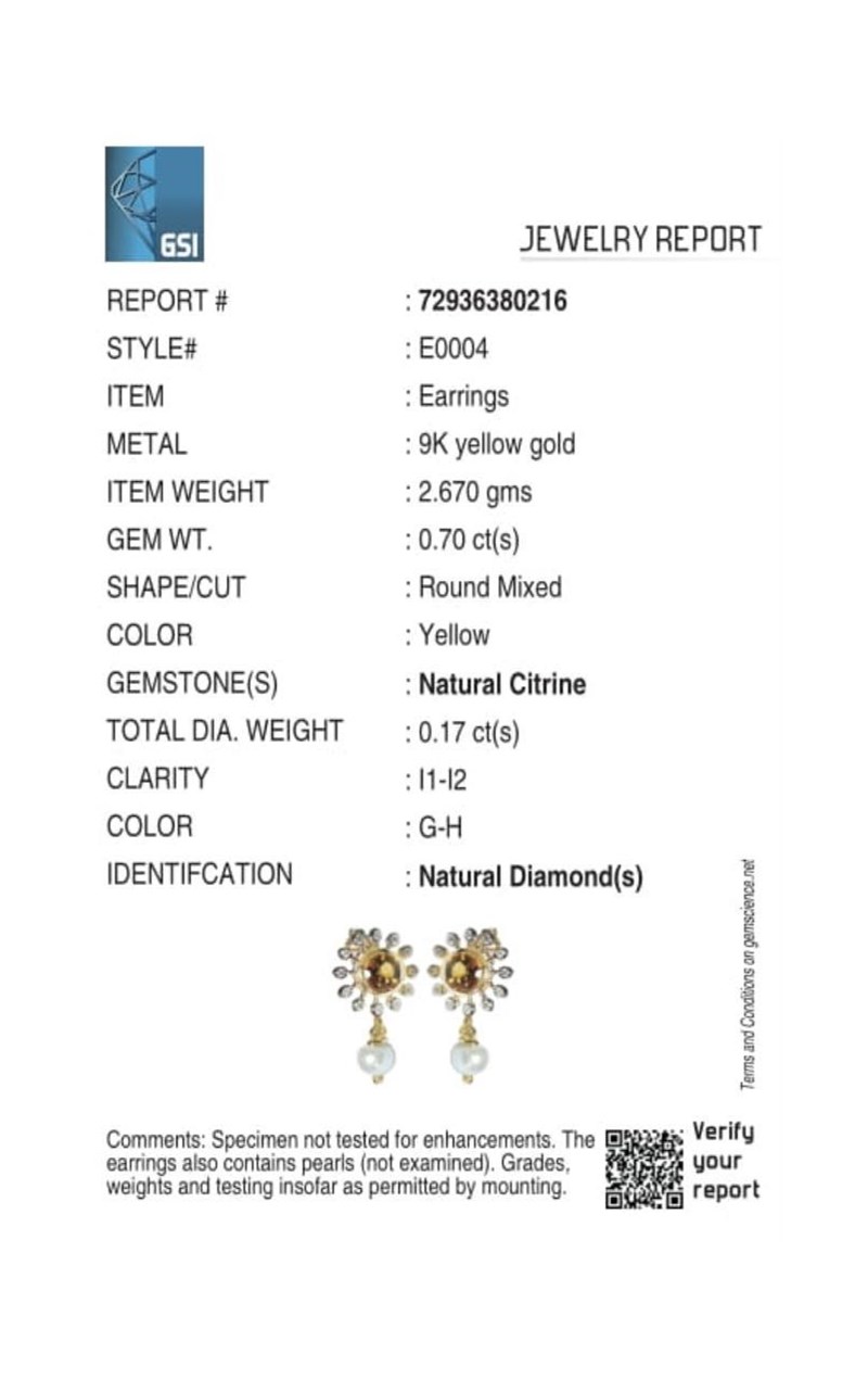9CT YELLOW GOLD NATURAL CITRINE / NATURAL PEARL & DIAMOND EARRINGS Weight Of The Item: 2.67 GFineness Of Metal(S): Yellow Gold 9KtThe Earrings Consists Of (2) Round Brilliant Natural Citrine & (2) Round Brilliant Cut Pearl. Surrounding The Main Stones Are Round Brilliant Cut Natural Diamonds.Identification: Natural Citrine / Natural PearlColor: Yellow / WhiteShape: Round Brilliant Cut / Round Faceted CutNo. Of Stone: 4Dimension: 5 Mm X 5 Mm X 3 MmWeight: 0.7 Carats / 1.43 CaratsCut: Very GoodIdentification: Natural DiamondShape: Round Brilliant CutWeight: 0.17 CtsCertificates Are Provided By Gemological Science International (Gsi), An Independent Third-Party Gemological Laboratory Based In The Usa And Recognised Among The Top 10 Gem Labs Globally Condition: Good - Refer Images 0160841+21
