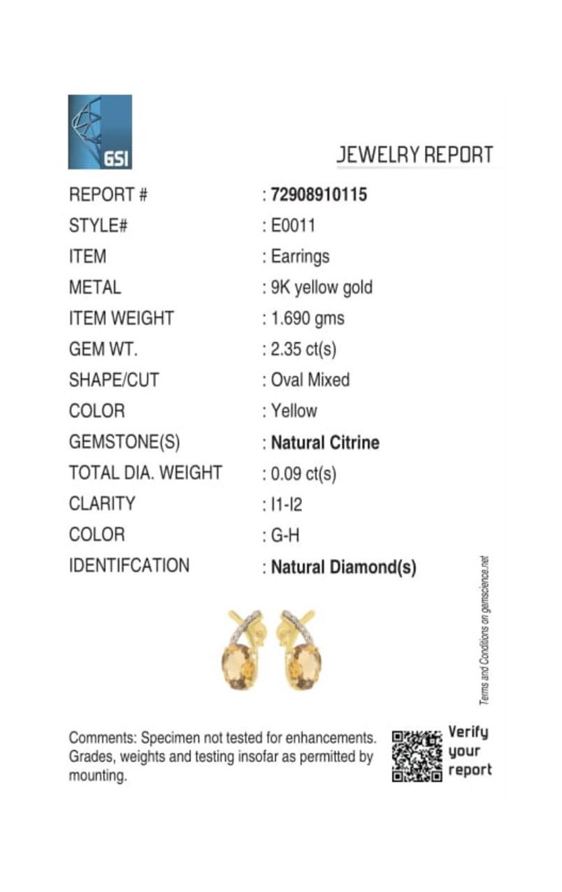9CT YELLOW GOLD NATURAL CITRINE & DIAMOND EARRINGS Weight Of The Item: 1.69 GFineness Of Metal(S): Yellow Gold 9KtThe Earrings Consists Of (2) Oval Brilliant Natural Citrine. Surrounding The Main Stones Are Round Brilliant Cut Natural Diamonds.Identification: Natural CitrineColor: YellowShape: Oval Brilliant CutNo. Of Stone: 2Dimension: 8 Mm X 6 Mm X 4.8 MmWeight: 2.35 CaratsCut: Very GoodIdentification: Natural DiamondShape: Round Brilliant CutWeight: 0.09 CtsCertificates Are Provided By Gemological Science International (Gsi), An Independent Third-Party Gemological Laboratory Based In The Usa And Recognised Among The Top 10 Gem Labs Globally Condition: Good - Refer Images 0160841+64