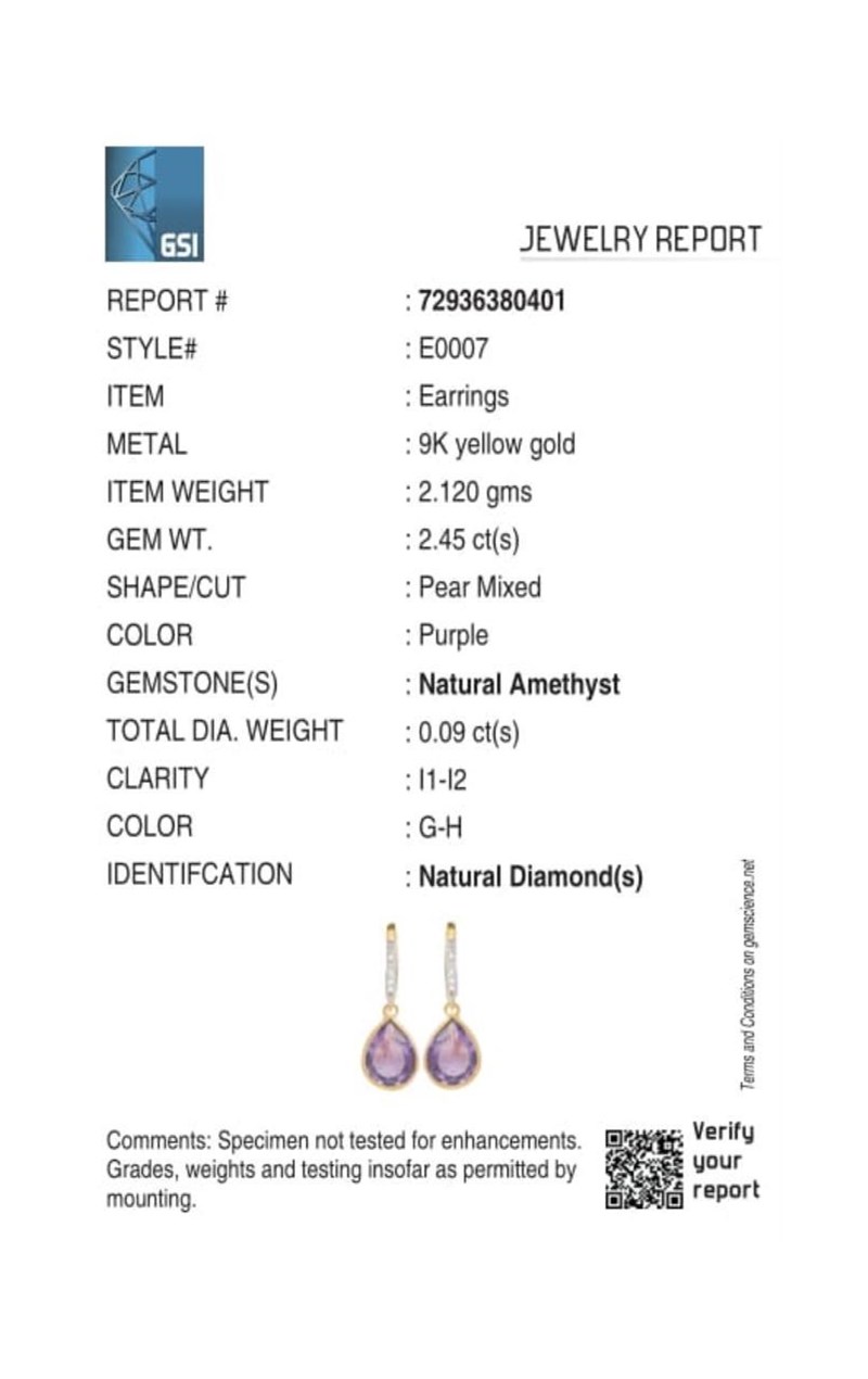 9CT YELLOW GOLD NATURAL AMETHYST & DIAMOND EARRINGS Weight Of The Item: 2.12 GFineness Of Metal(S): Yellow Gold 9KtThe Earrings Consists Of (2) Pear Brilliant Natural Amethyst. Surrounding The Main Stones Are Round Brilliant Cut Natural Diamonds.Identification: Natural AmethystColor: PurpleShape: Pear Brilliant CutNo. Of Stone: 2Dimension: 9 Mm X 7 Mm X 5.4 MmWeight: 2.45 CaratsCut: Very GoodIdentification: Natural DiamondShape: Round Brilliant CutWeight: 0.09 CtsCertificates Are Provided By Gemological Science International (Gsi), An Independent Third-Party Gemological Laboratory Based In The Usa And Recognised Among The Top 10 Gem Labs Globally Condition: Good - Refer Images 0160841+39