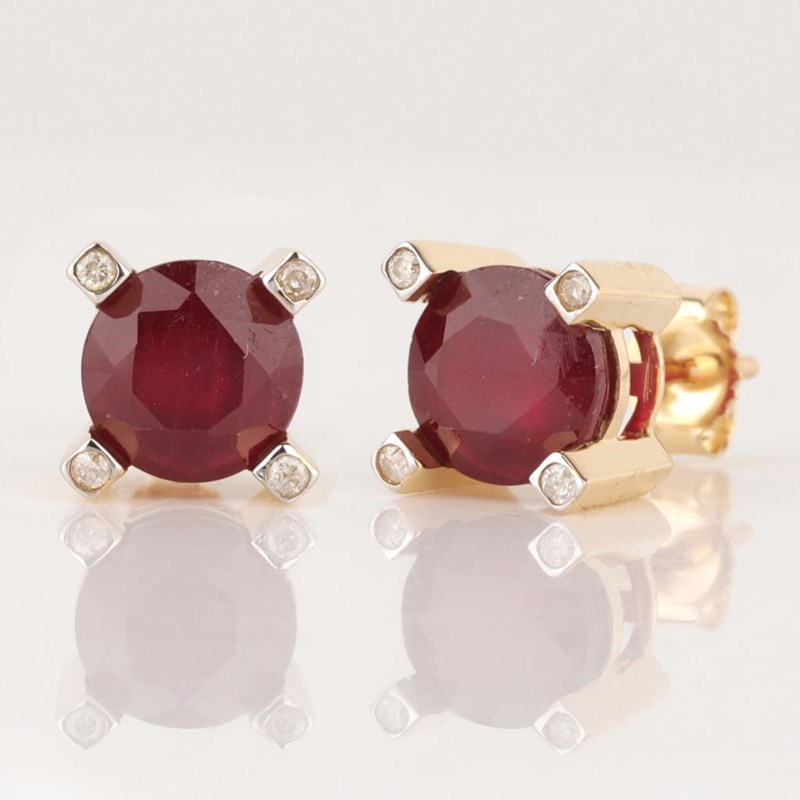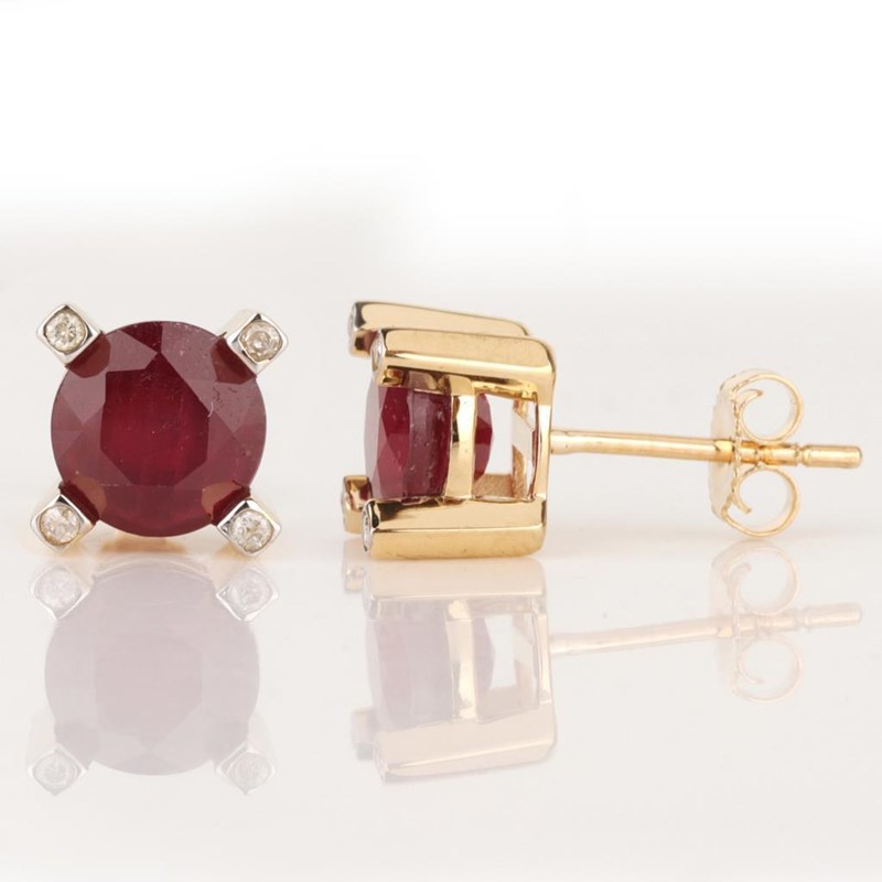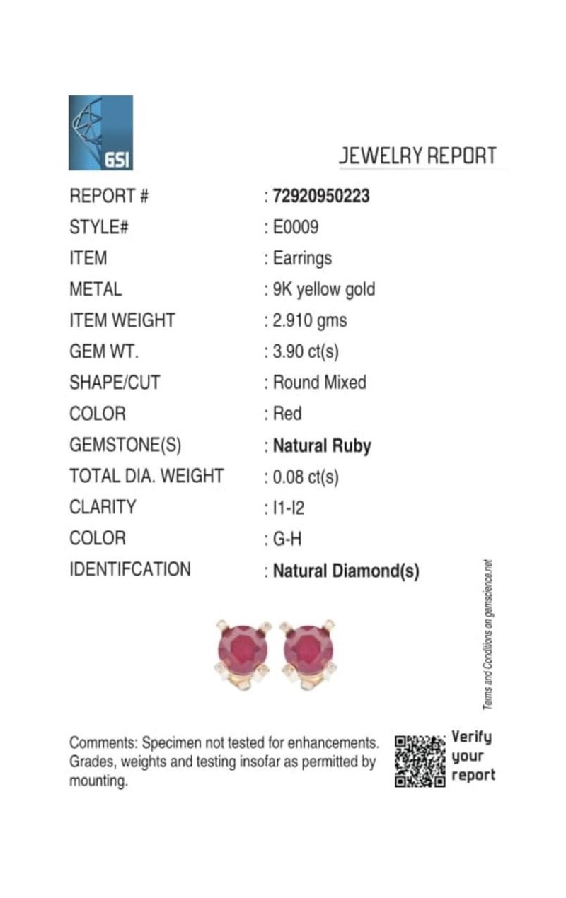 9CT YELLOW GOLD NATURAL RUBY & DIAMOND EARRINGS Weight Of The Item: 2.91 GFineness Of Metal(S): Yellow Gold 9KtThe Earrings Consists Of (2) Round Brilliant Natural Ruby. Surrounding The Main Stones Are Round Brilliant Cut Natural Diamonds.Identification: Natural RubyColor: RedShape: Round Brilliant CutNo. Of Stone: 2Dimension: 7 Mm X 7 Mm X 4.2 MmWeight: 3.9 CaratsCut: Very GoodIdentification: Natural DiamondShape: Round Brilliant CutWeight: 0.08 CtsCertificates Are Provided By Gemological Science International (Gsi), An Independent Third-Party Gemological Laboratory Based In The Usa And Recognised Among The Top 10 Gem Labs Globally Condition: Good - Refer Images 0160841+53