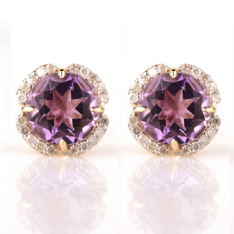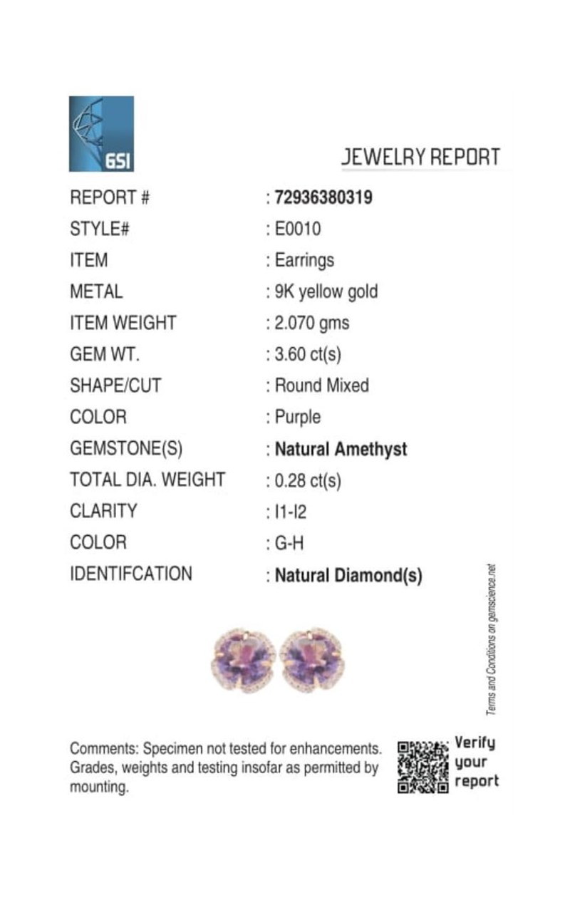 9CT YELLOW GOLD NATURAL AMETHYST & DIAMOND EARRINGS Weight Of The Item: 2.07 GFineness Of Metal(S): Yellow Gold 9KtThe Earrings Consists Of (2) Round Brilliant Natural Amethyst. Surrounding The Main Stones Are Round Brilliant Cut Natural Diamonds.Identification: Natural AmethystColor: PurpleShape: Round Brilliant CutNo. Of Stone: 2Dimension: 8 Mm X 8 Mm X 4.8 MmWeight: 3.6 CaratsCut: Very GoodIdentification: Natural DiamondShape: Round Brilliant CutWeight: 0.28 CtsCertificates Are Provided By Gemological Science International (Gsi), An Independent Third-Party Gemological Laboratory Based In The Usa And Recognised Among The Top 10 Gem Labs Globally Condition: Good - Refer Images 0160841+57