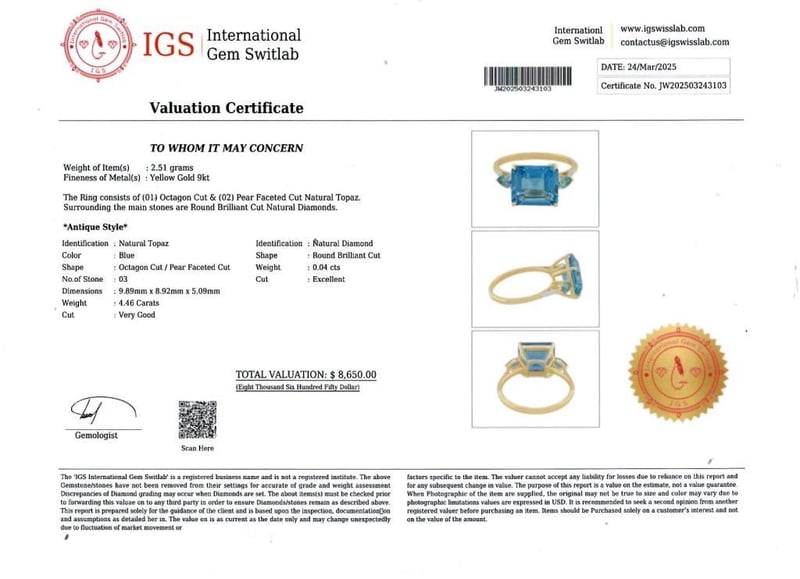 9CT YELLOW GOLD AND BLUE TOPAZ RING Valuations Provided by an Independent Third-Party Professional Not Directly Associated With Lloyds Auctions at AUD $8650 This valuation has been conducted by an independent third-party professional. The valuation amount is an assessment by the issuing valuer and does not reflect the auction value of the item. Any inquiries regarding the valuation should be directed to the issuing valuer (refer to contact details on the certificate), as Lloyds Auctions has no affiliation or influence over the valuation, the valuer, or the stated amount. Condition: Good - Refer Images 0 +243103