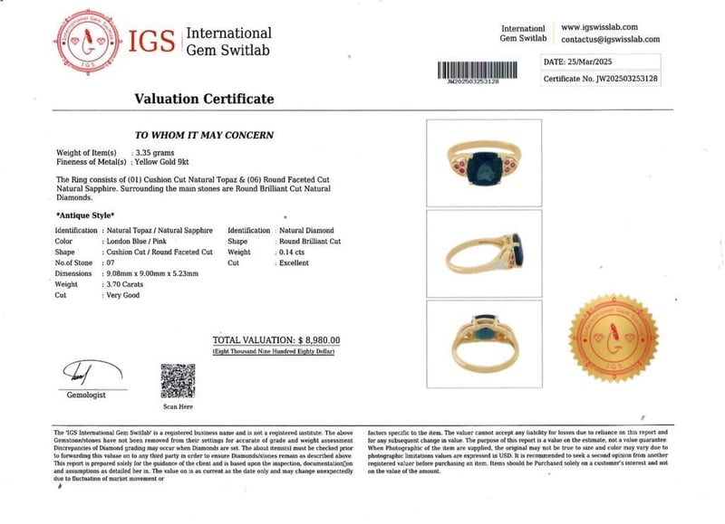 9CT YELLOW GOLD AND BLUE TOPAZ RING Valuations Provided by an Independent Third-Party Professional Not Directly Associated With Lloyds Auctions at AUD $8980 This valuation has been conducted by an independent third-party professional. The valuation amount is an assessment by the issuing valuer and does not reflect the auction value of the item. Any inquiries regarding the valuation should be directed to the issuing valuer (refer to contact details on the certificate), as Lloyds Auctions has no affiliation or influence over the valuation, the valuer, or the stated amount. Condition: Good - Refer Images 0 +253128