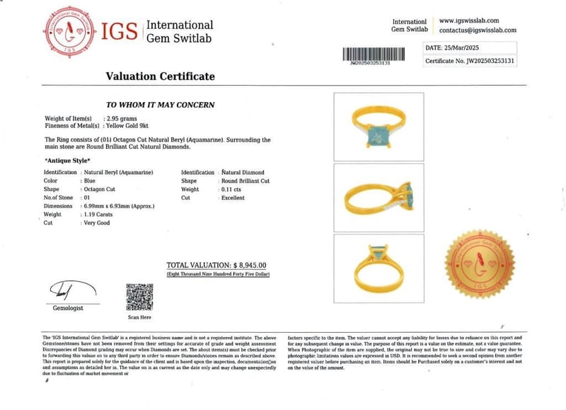 9CT YELLOW GOLD AQUAMARINE AND DIAMOND RING Valuations Provided by an Independent Third-Party Professional Not Directly Associated With Lloyds Auctions at AUD $8945 This valuation has been conducted by an independent third-party professional. The valuation amount is an assessment by the issuing valuer and does not reflect the auction value of the item. Any inquiries regarding the valuation should be directed to the issuing valuer (refer to contact details on the certificate), as Lloyds Auctions has no affiliation or influence over the valuation, the valuer, or the stated amount. Condition: Good - Refer Images 0 +253131