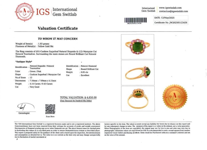 9CT YELLOW GOLD DIOPSIDE AND DIAMOND RING Date : 12-05-2025 Category : Ring Comment : Yellow Gold 9K Natural Diopside : 4.14 Carats Natural Tourmaline : 0.43 Carats Natural Diamond : 0.05 Carats Item Weight : 1.93 G Valuations Provided by an Independent Third-Party Professional Not Directly Associated With Lloyds Auctions at AUD $4650 This valuation has been conducted by an independent third-party professional. The valuation amount is an assessment by the issuing valuer and does not reflect the auction value of the item. Any inquiries regarding the valuation should be directed to the issuing valuer (refer to contact details on the certificate), as Lloyds Auctions has no affiliation or influence over the valuation, the valuer, or the stated amount. Condition: Good - Refer Images 0 488052+3