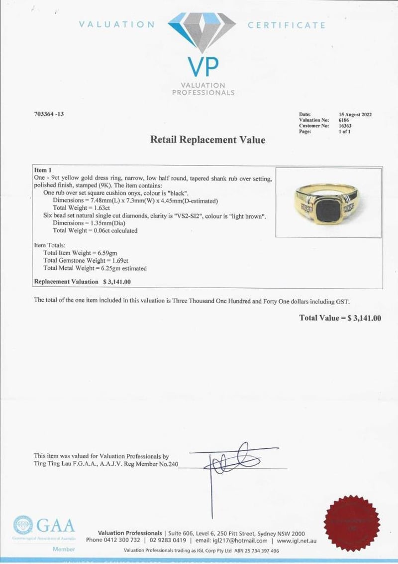9K YELLOW GOLD 1.69 CARAT GENTS DIAMOND & ONYX RING 1 Natural Onyx = 1.63 Carats 6 Brilliant Natural Diamond = 0.06 Carat Ring Weight = 6.60 Grams Finger Size T ( Size 10 ) Valuations Provided by an Independent Third-Party Professional Not Directly Associated With Lloyds Auctions at AUD $3141This valuation has been conducted by an independent third-party professional. The valuation amount is an assessment by the issuing valuer and does not reflect the auction value of the item. Any inquiries regarding the valuation should be directed to the issuing valuer (refer to contact details on the certificate), as Lloyds Auctions has no affiliation or influence over the valuation, the valuer, or the stated amount. Condition: Good - Refer Images 0488962+7