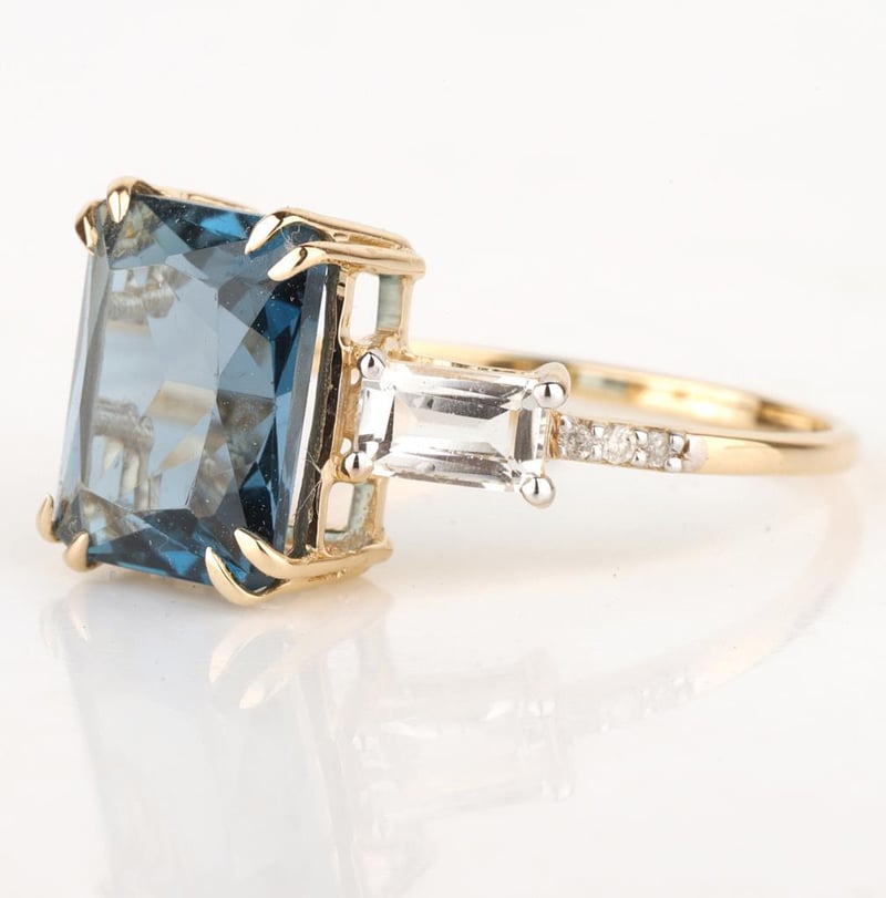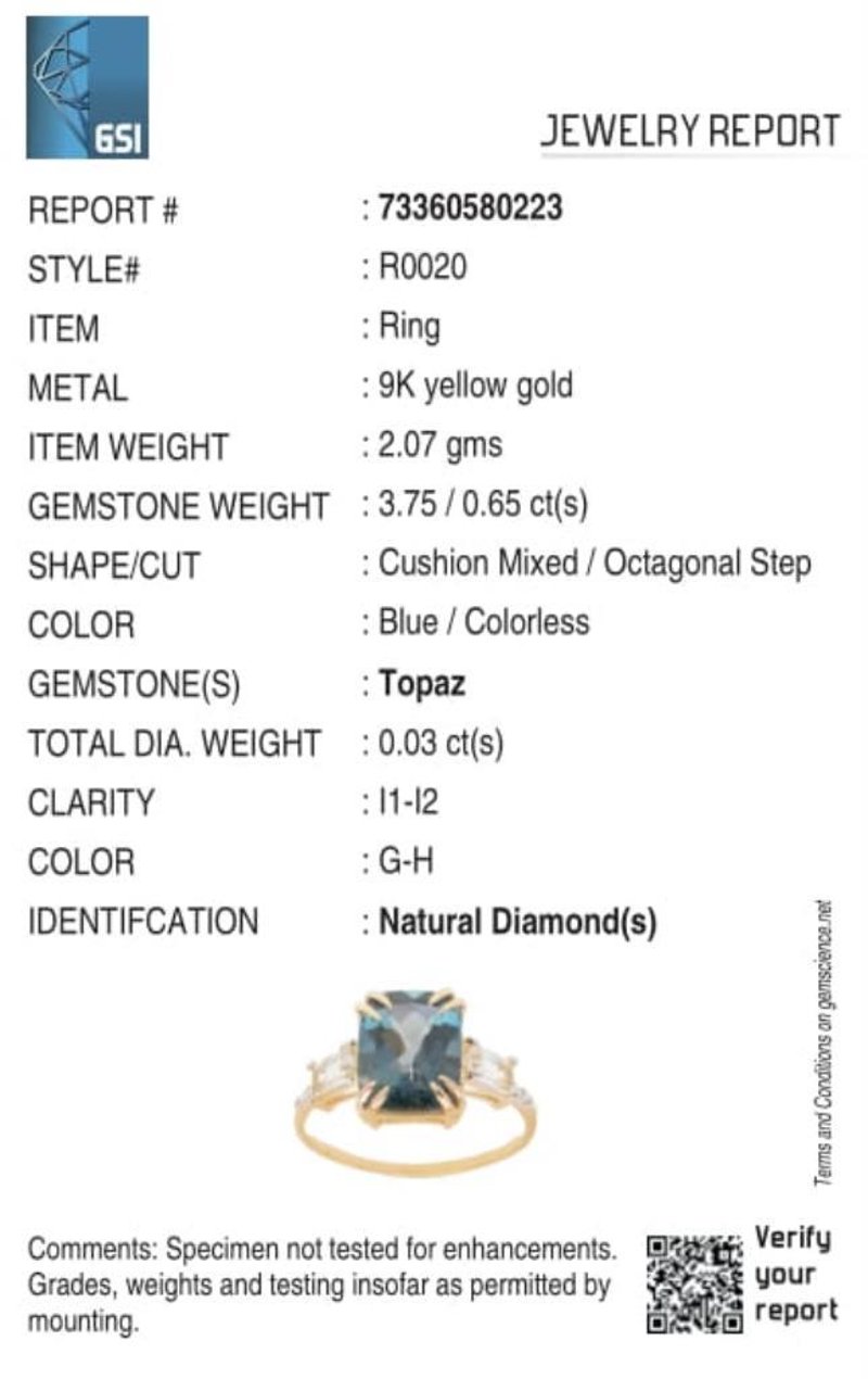 9CT YELLOW GOLD NATURAL LONDON BLUE TOPAZ / NATURAL WHITE TOPAZ & DIAMOND RING Weight Of The Item: 2.07 GFineness Of Metal(S): Yellow Gold 9KtThe Ring Consists Of (1) Octagon Brilliant Natural London Blue Topaz & (2) Octagon Step Cut White Topaz. Surrounding The Main Stones Are Round Brilliant Cut Natural Diamonds.Antique StyleIdentification: Natural London Blue Topaz / Natural White TopazColor: Blue / WhiteShape: Octagon Brilliant Cut / Octagon Faceted CutNo. Of Stone: 3Dimension: 10 Mm X 8 Mm X 6 MmWeight: 3.75 Carats / 0.65 CaratsCut: Very GoodIdentification: Natural DiamondShape: Round Brilliant CutWeight: 0.03 CtsCut: Excellent. Certificates Are Provided By Gemological Science International (Gsi), An Independent Third-Party Gemological Laboratory Based In The Usa And Recognised Among The Top 10 Gem Labs Globally Condition: Good - Refer Images 0488266+50