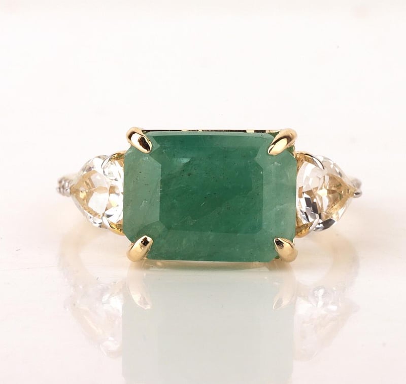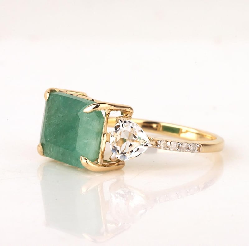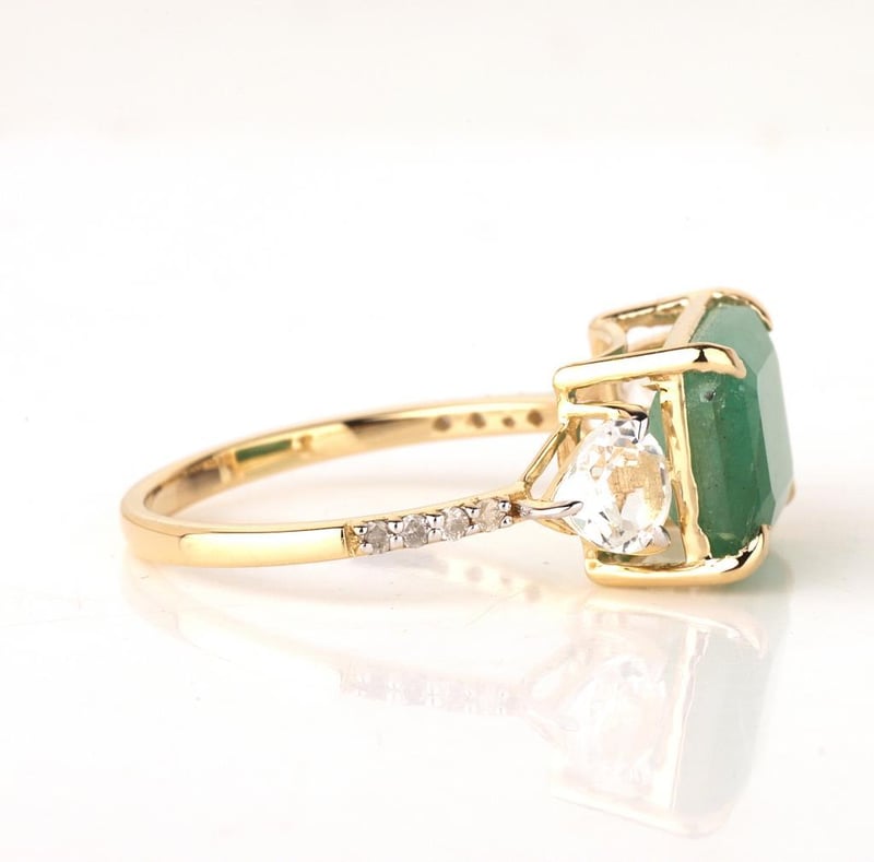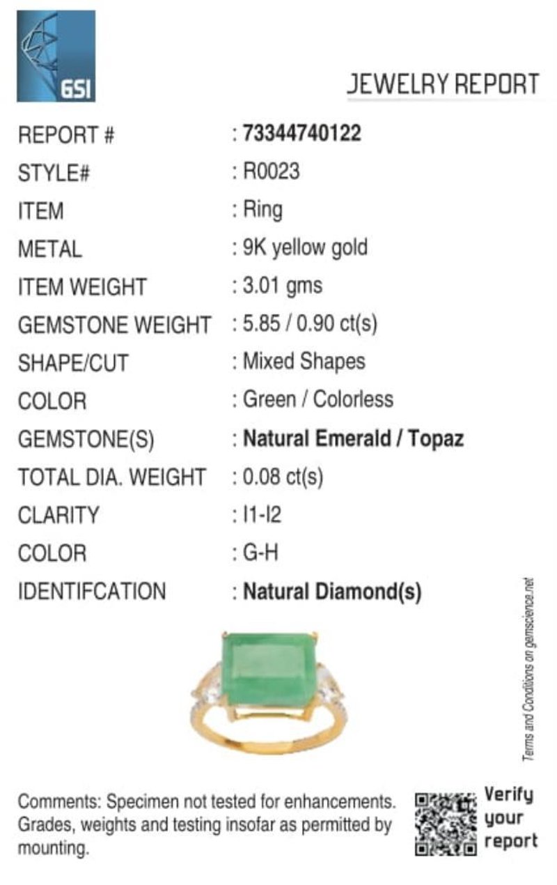 9CT YELLOW GOLD NATURAL EMERALD / NATURAL WHITE TOPAZ & DIAMOND RING Weight Of The Item: 3.01 GFineness Of Metal(S): Yellow Gold 9KtThe Ring Consists Of (1) Octagon Brilliant Natural Emerald & (2) Trillion Brilliant Cut White Topaz. Surrounding The Main Stones Are Round Brilliant Cut Natural Diamonds.Antique StyleIdentification: Natural Emerald / Natural White TopazColor: Green / WhiteShape: Octagon Brilliant Cut / Trillion Faceted CutNo. Of Stone: 3Dimension: 11 Mm X 9 Mm X 6.6 MmWeight: 5.85 Carats / 0.9 CaratsCut: Very GoodIdentification: Natural DiamondShape: Round Brilliant CutWeight: 0.08 CtsCut: Excellent. Certificates Are Provided By Gemological Science International (Gsi), An Independent Third-Party Gemological Laboratory Based In The Usa And Recognised Among The Top 10 Gem Labs Globally Condition: Good - Refer Images 0488266+53