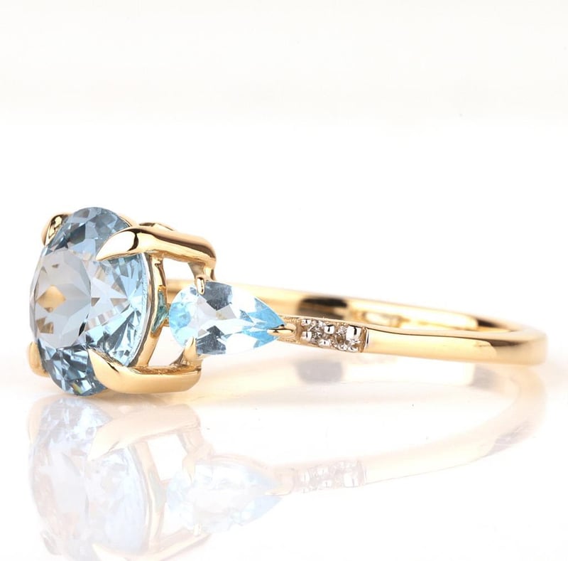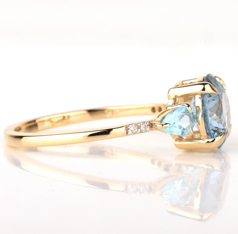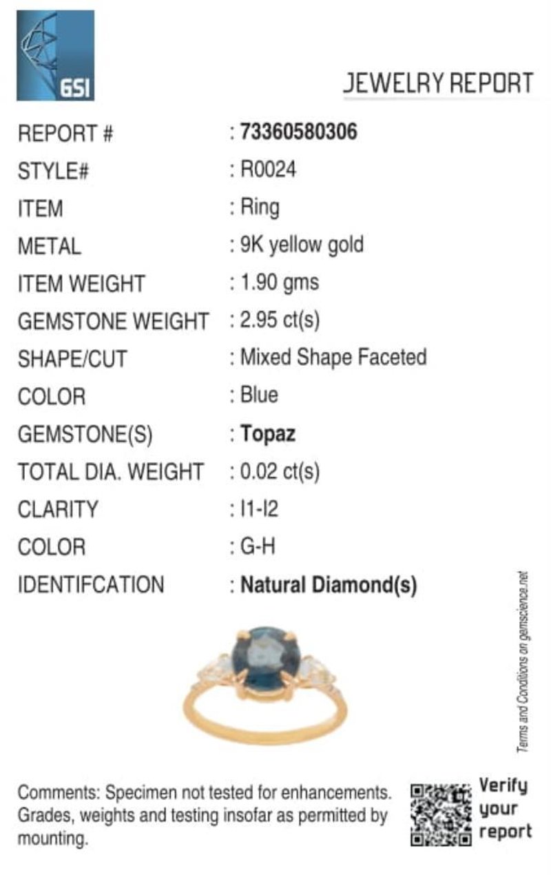 9CT YELLOW GOLD NATURAL LONDON BLUE TOPAZ / NATURAL SWISS BLUE TOPAZ & DIAMOND RING Weight Of The Item: 1.9 GFineness Of Metal(S): Yellow Gold 9KtThe Ring Consists Of (1) Round Brilliant Natural London Blue Topaz & (2) Pear Brilliant Cut Swiss Blue Topaz. Surrounding The Main Stones Are Round Brilliant Cut Natural Diamonds.Antique StyleIdentification: Natural London Blue Topaz / Natural Swiss Blue TopazColor: Blue / BlueShape: Round Brilliant Cut / Pear Faceted CutNo. Of Stone: 3Dimension: 8 Mm X 8 Mm X 4.8 MmWeight: 2.95 Carats / 0 CaratsCut: Very GoodIdentification: Natural DiamondShape: Round Brilliant CutWeight: 0.02 CtsCut: Excellent. Certificates Are Provided By Gemological Science International (Gsi), An Independent Third-Party Gemological Laboratory Based In The Usa And Recognised Among The Top 10 Gem Labs Globally Condition: Good - Refer Images 0488266+57