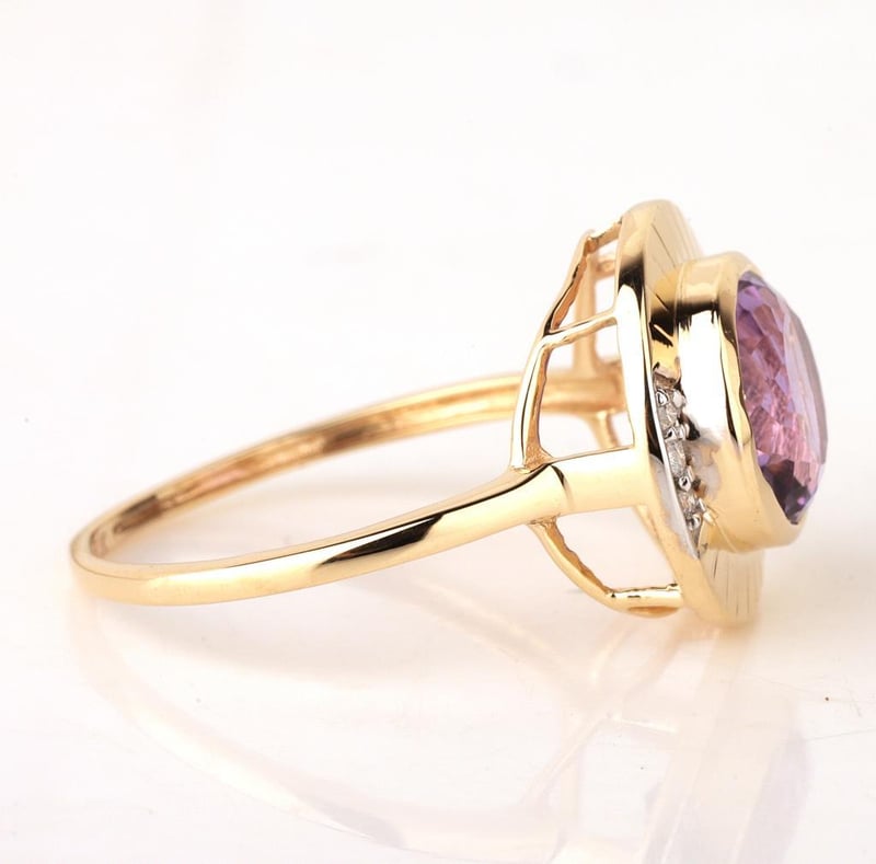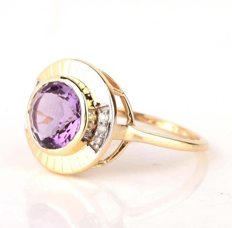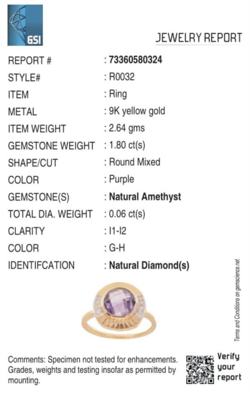 9CT YELLOW GOLD NATURAL AMETHYST & DIAMOND RING Weight Of The Item: 2.64 GFineness Of Metal(S): Yellow Gold 9KtThe Ring Consists Of (1) Round Brilliant Natural Amethyst. Surrounding The Main Stones Are Round Brilliant Cut Natural Diamonds.Antique StyleIdentification: Natural AmethystColor: PurpleShape: Round Brilliant CutNo. Of Stone: 1Dimension: 8 Mm X 8 Mm X 4.8 MmWeight: 1.8 CaratsCut: Very GoodIdentification: Natural DiamondShape: Round Brilliant CutWeight: 0.06 CtsCut: Excellent. Certificates Are Provided By Gemological Science International (Gsi), An Independent Third-Party Gemological Laboratory Based In The Usa And Recognised Among The Top 10 Gem Labs Globally Condition: Good - Refer Images 0488266+75
