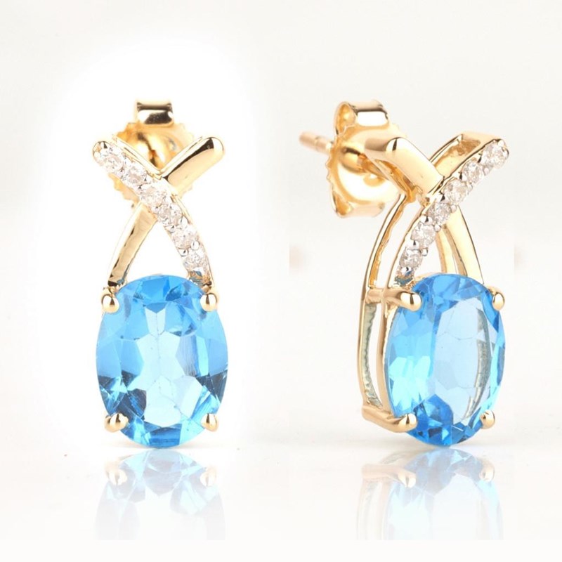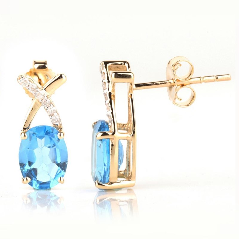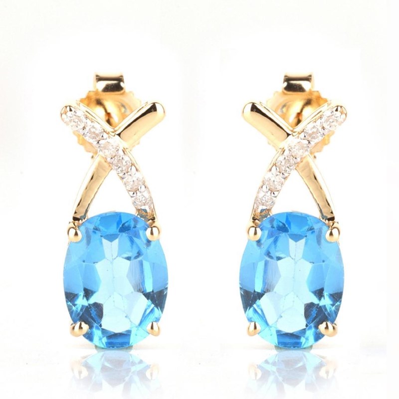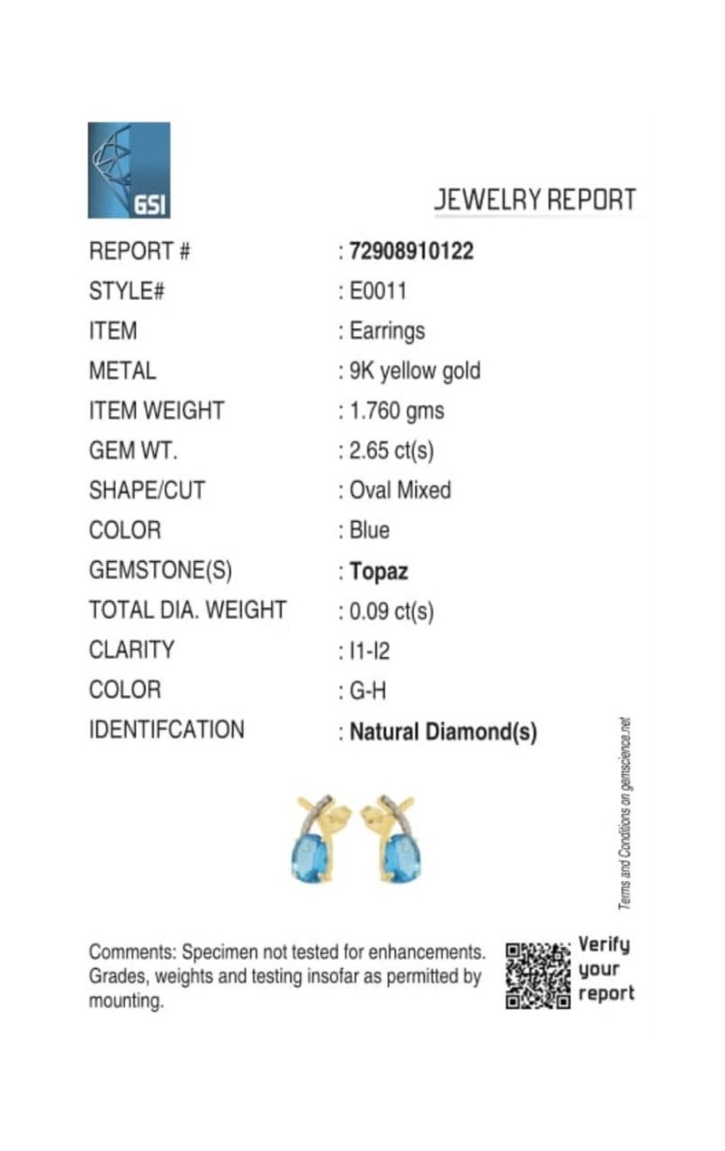 9CT YELLOW GOLD NATURAL SWISS BLUE TOPAZ & DIAMOND EARRINGS Weight Of The Item: 1.76 GFineness Of Metal(S): Yellow Gold 9KtThe Earrings Consists Of (2) Oval Brilliant Natural Swiss Blue Topaz. Surrounding The Main Stones Are Round Brilliant Cut Natural Diamonds.Identification: Natural Swiss Blue TopazColor: BlueShape: Oval Brilliant CutNo. Of Stone: 2Dimension: 8 Mm X 6 Mm X 4.8 MmWeight: 2.65 CaratsCut: Very GoodIdentification: Natural DiamondShape: Round Brilliant CutWeight: 0.09 CtsCertificates Are Provided By Gemological Science International (Gsi), An Independent Third-Party Gemological Laboratory Based In The Usa And Recognised Among The Top 10 Gem Labs Globally Condition: Good - Refer Images 0160841+69