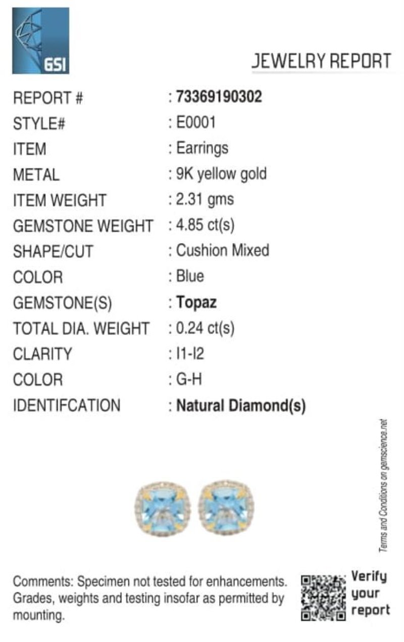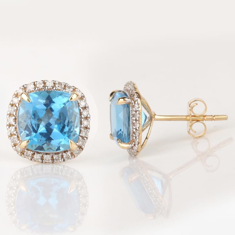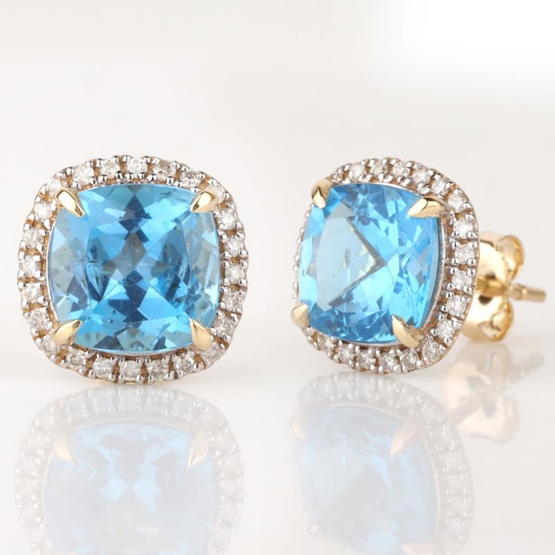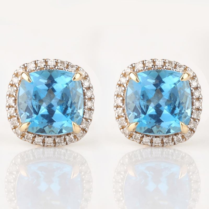 The Earrings Consists Of (2) Cushion Brilliant Natural Swiss Blue Topaz. Surrounding The Main Stones Are Round Brilliant Cut Natural Diamonds.