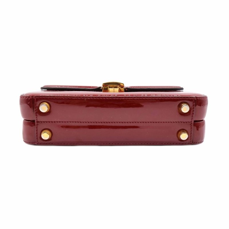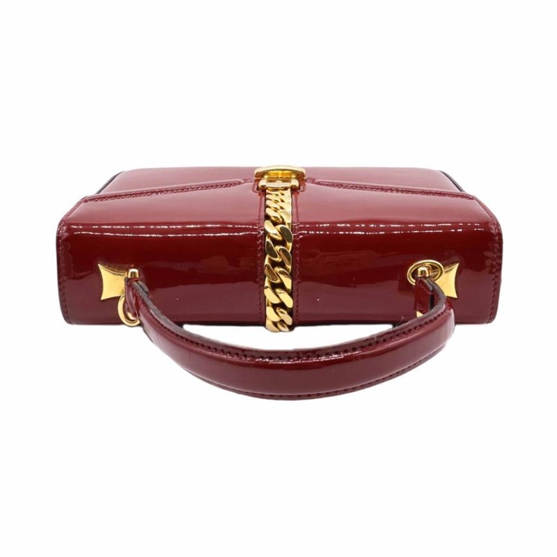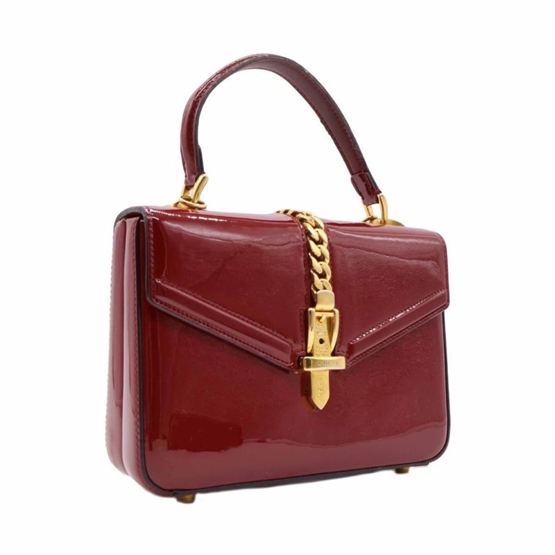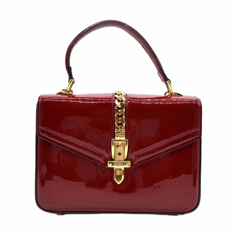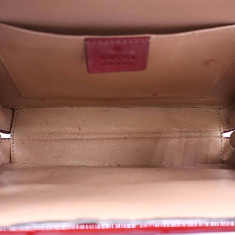 GUCCI RED PATENT LEATHER MINI SYLVIE 1969 TOP HANDLE BAG Exterior Material Patent leather with gold-tone hardware, single top handle, protective metal feet and buckle lock closure. Interior Material Leather lining with a main compartment and a patch pocket. Length: 21cm Height: 15cm Depth: 5.5cm Handle Drop: 9cm Additional Condition Report - Moderate sign of wear and tears on exterior - Visible wear and stains in interior - Sign of wear and scratches on hardware Comes With - * Missing Shoulder Strap * - Certificate of Authenticity 162837+03 XD