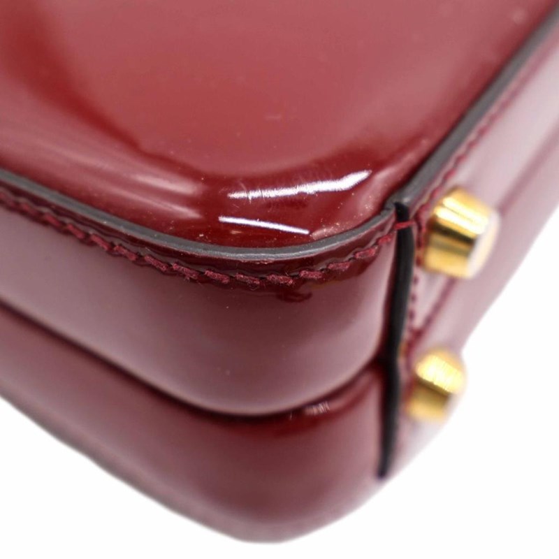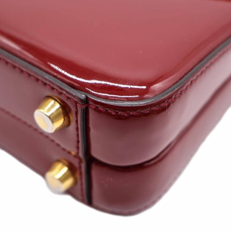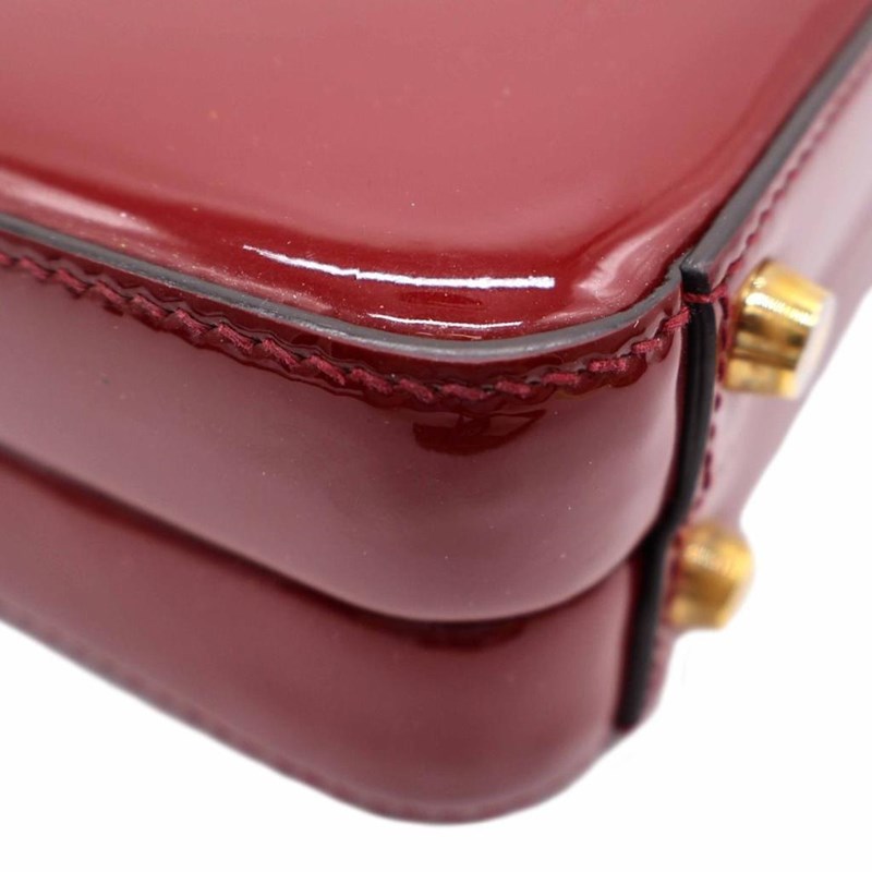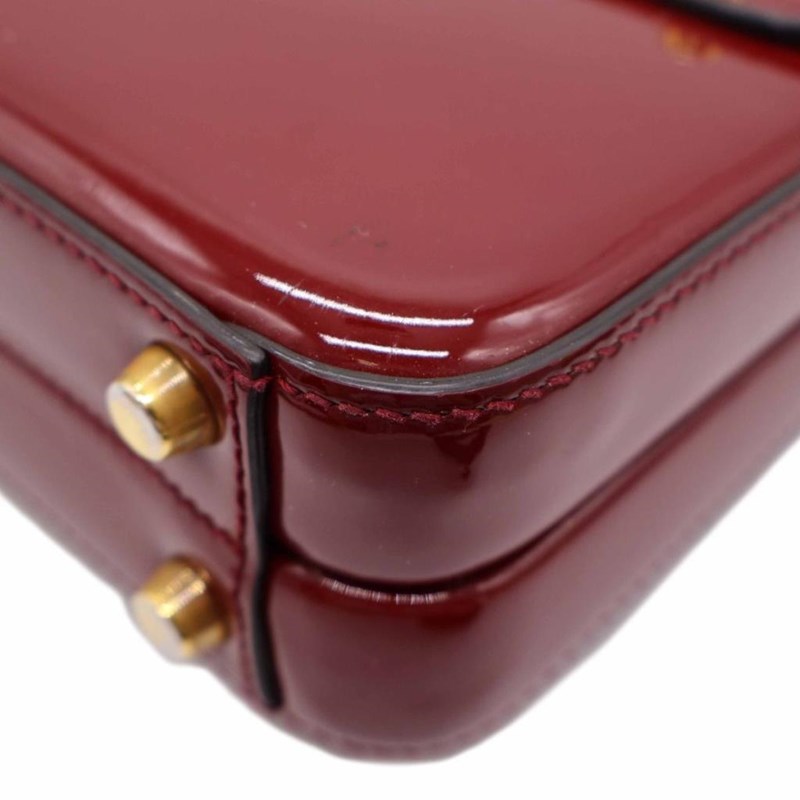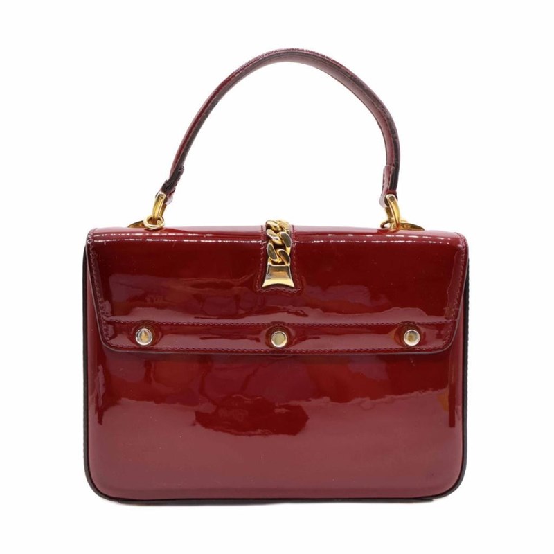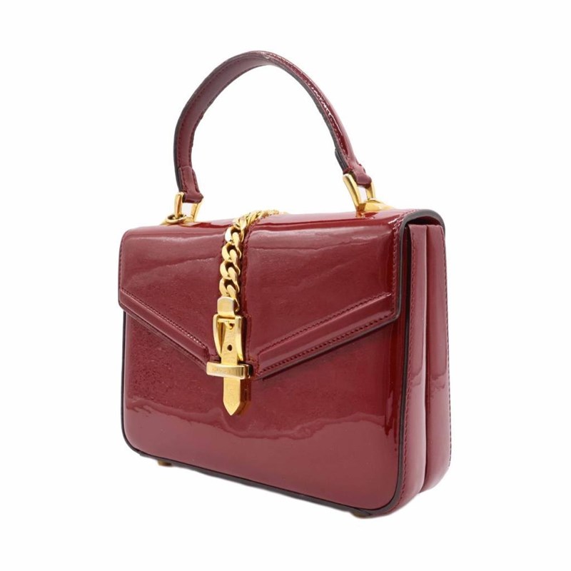 GUCCI RED PATENT LEATHER MINI SYLVIE 1969 TOP HANDLE BAG Exterior Material Patent leather with gold-tone hardware, single top handle, protective metal feet and buckle lock closure. Interior Material Leather lining with a main compartment and a patch pocket. Length: 21cm Height: 15cm Depth: 5.5cm Handle Drop: 9cm Additional Condition Report - Moderate sign of wear and tears on exterior - Visible wear and stains in interior - Sign of wear and scratches on hardware Comes With - * Missing Shoulder Strap * - Certificate of Authenticity 162837+03 XD