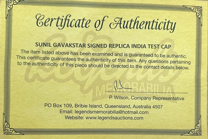 SUNIL GAVASKAR SIGNED REPLICA INDIAN TEST CAP A Replica Indian Test Cap Personally Signed By Sunil Gavaskar. Sunil Gavaskar Is A Former Captain Of The Indian National Cricket Team, Representing India And Mumbai From 1971 To 1987. Widely Recognised As One Of The Greatest Batsmen In Cricket History, He Now Is A Respected Commentator. The Item Is Accompanied By A Certificate Of Authenticity.Condition: Good - Refer To Images584939+18