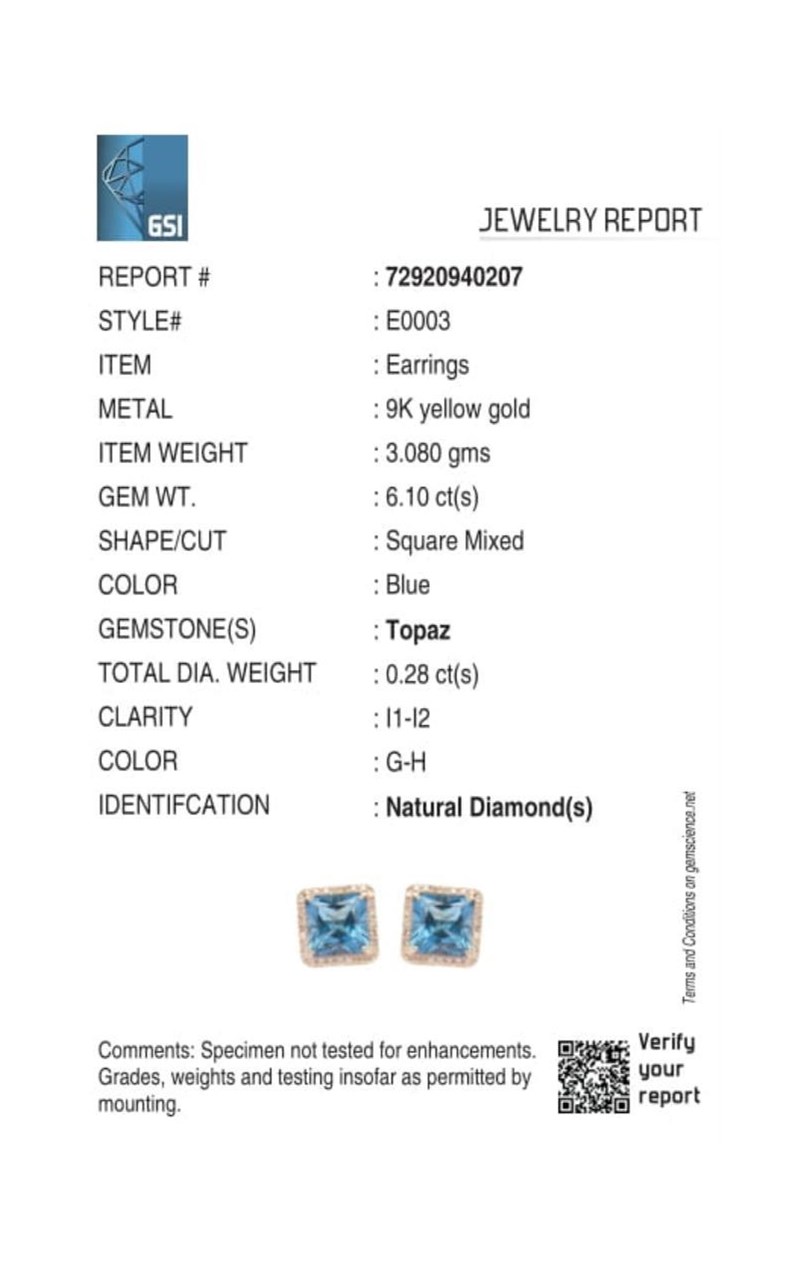 9CT YELLOW GOLD NATURAL LONDON BLUE TOPAZ & DIAMOND EARRINGS Weight Of The Item: 3.08 GFineness Of Metal(S): Yellow Gold 9KtThe Earrings Consists Of (2) Square Brilliant Natural London Blue Topaz. Surrounding The Main Stones Are Round Brilliant Cut Natural Diamonds.Identification: Natural London Blue TopazColor: BlueShape: Square Brilliant CutNo. Of Stone: 2Dimension: 8 Mm X 8 Mm X 4.8 MmWeight: 6.1 CaratsCut: Very GoodIdentification: Natural DiamondShape: Round Brilliant CutWeight: 0.28 CtsCertificates Are Provided By Gemological Science International (Gsi), An Independent Third-Party Gemological Laboratory Based In The Usa And Recognised Among The Top 10 Gem Labs Globally Condition: Good - Refer Images 0160841+17