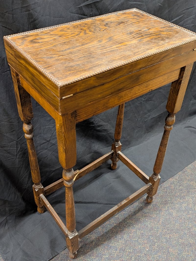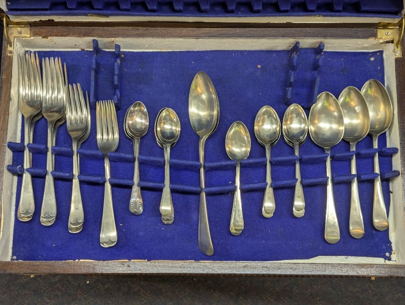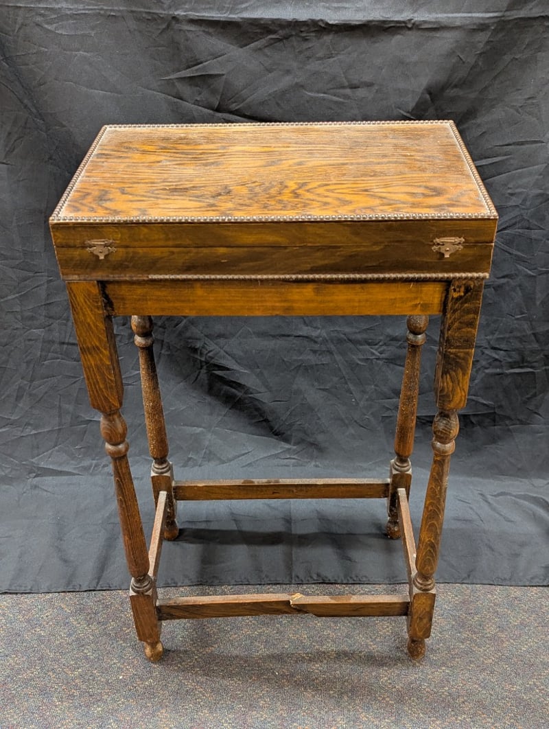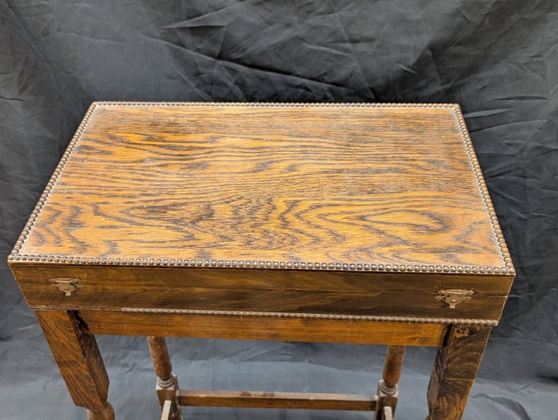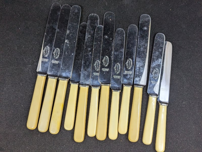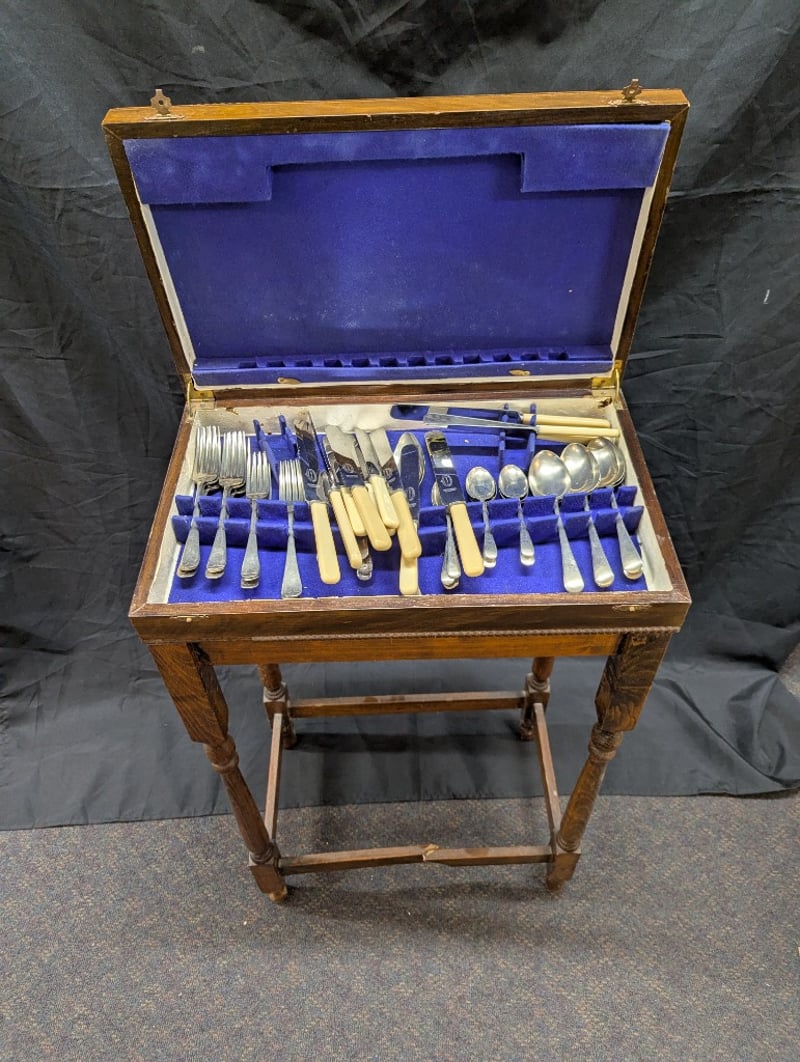 COLLECTION OF 'SHEFFIELD' CUTLERY IN STORAGE SIDE TABLE Item Size: Height: 79cm, Width: 46cm, Depth: 28cm Cutlery Includes Butter Knives, Forks, Spoons, Knives Feature Cream Handles, Timber Construction, Folding Top Lid Leg Support Beam Broken Condition: Good - Refer To Images 584909+7