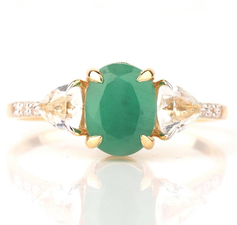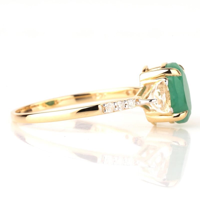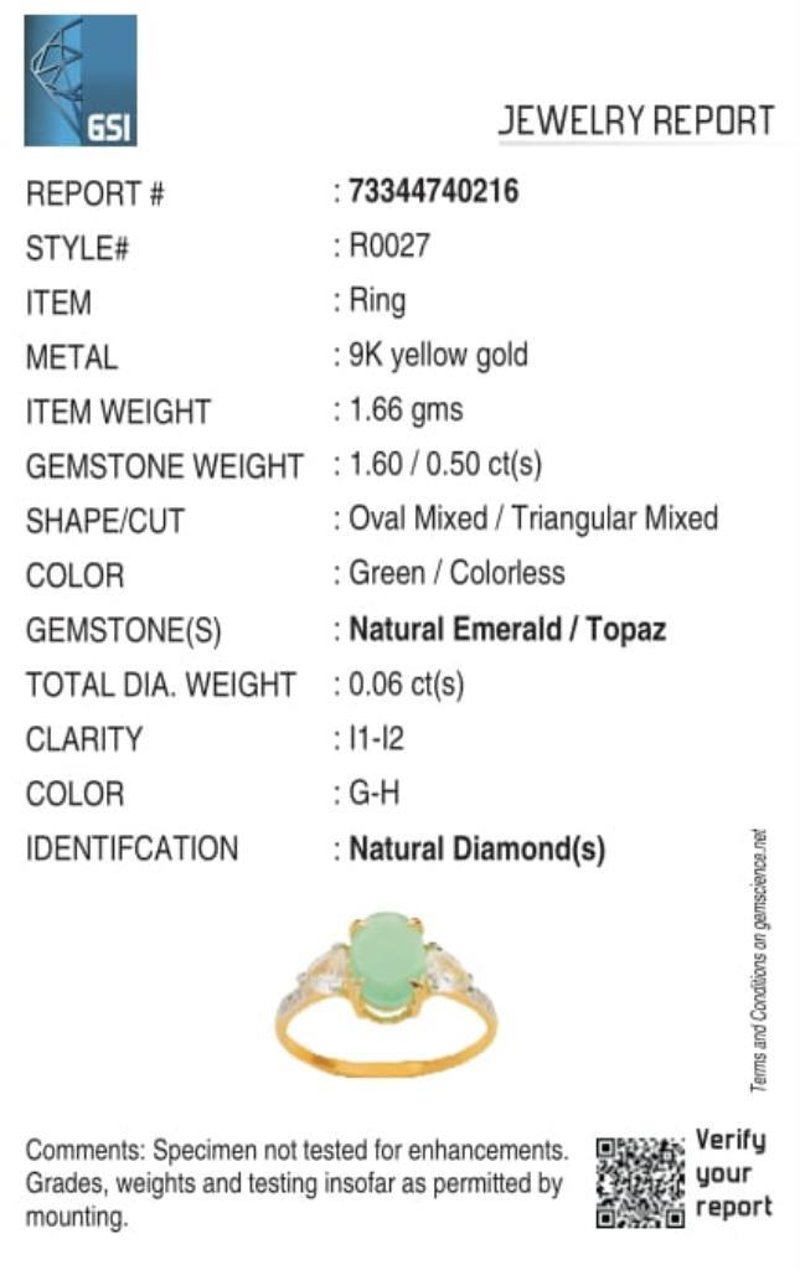 9CT YELLOW GOLD NATURAL EMERALD / NATURAL WHITE TOPAZ & DIAMOND RING Weight Of The Item: 1.66 GFineness Of Metal(S): Yellow Gold 9KtThe Ring Consists Of (1) Oval Brilliant Natural Emerald & (2) Trillion Brilliant Cut White Topaz. Surrounding The Main Stones Are Round Brilliant Cut Natural Diamonds.Antique StyleIdentification: Natural Emerald / Natural White TopazColor: Green / WhiteShape: Oval Brilliant Cut / Trillion Faceted CutNo. Of Stone: 3Dimension: 8 Mm X 6 Mm X 4.8 MmWeight: 1.6 Carats / 0.5 CaratsCut: Very GoodIdentification: Natural DiamondShape: Round Brilliant CutWeight: 0.06 CtsCut: Excellent. Certificates Are Provided By Gemological Science International (Gsi), An Independent Third-Party Gemological Laboratory Based In The Usa And Recognised Among The Top 10 Gem Labs Globally Condition: Good - Refer Images 0488266+65