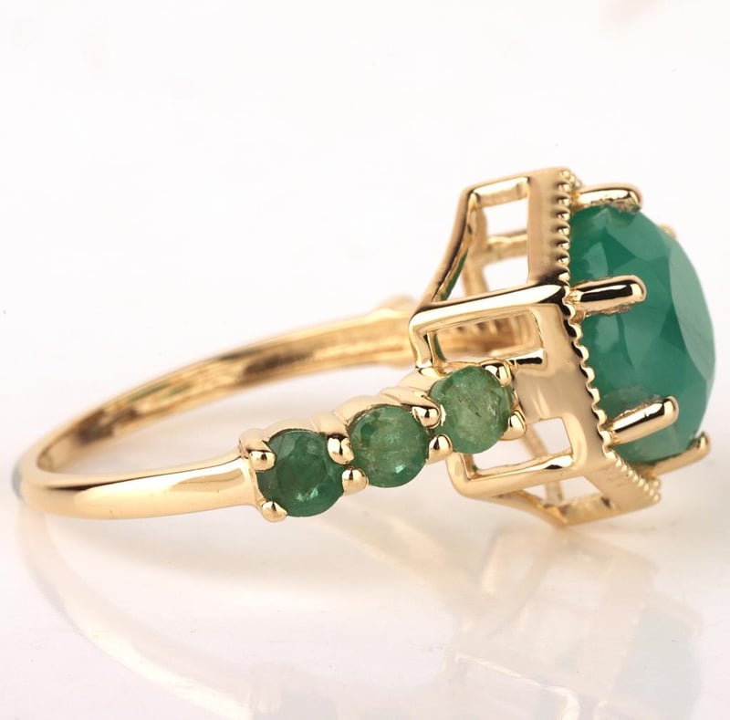 The Ring Consists Of (1) Round Brilliant Natural Emerald & (3) Round Brilliant Cut Emerald. Surrounding The Main Stones Are Round Brilliant Cut Natural Diamonds.