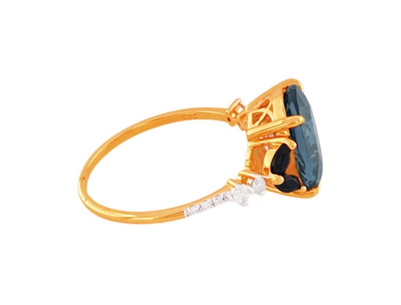 9CT YELLOW GOLD BLUE TOPAZ ONYX AND DIAMOND RING