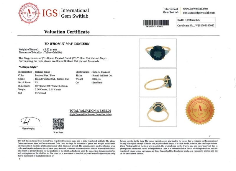9CT YELLOW GOLD BLUE TOPAZ RING Valuations Provided by an Independent Third-Party Professional Not Directly Associated With Lloyds Auctions at AUD $8635 This valuation has been conducted by an independent third-party professional. The valuation amount is an assessment by the issuing valuer and does not reflect the auction value of the item. Any inquiries regarding the valuation should be directed to the issuing valuer (refer to contact details on the certificate), as Lloyds Auctions has no affiliation or influence over the valuation, the valuer, or the stated amount. Condition: Good - Refer Images 0 +183042