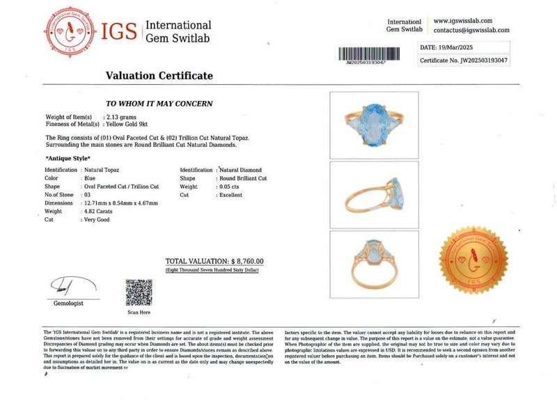 9CT YELLOW GOLD AND BLUE TOPAZ RING Valuations Provided by an Independent Third-Party Professional Not Directly Associated With Lloyds Auctions at AUD $8760 This valuation has been conducted by an independent third-party professional. The valuation amount is an assessment by the issuing valuer and does not reflect the auction value of the item. Any inquiries regarding the valuation should be directed to the issuing valuer (refer to contact details on the certificate), as Lloyds Auctions has no affiliation or influence over the valuation, the valuer, or the stated amount. Condition: Good - Refer Images 0 +193047
