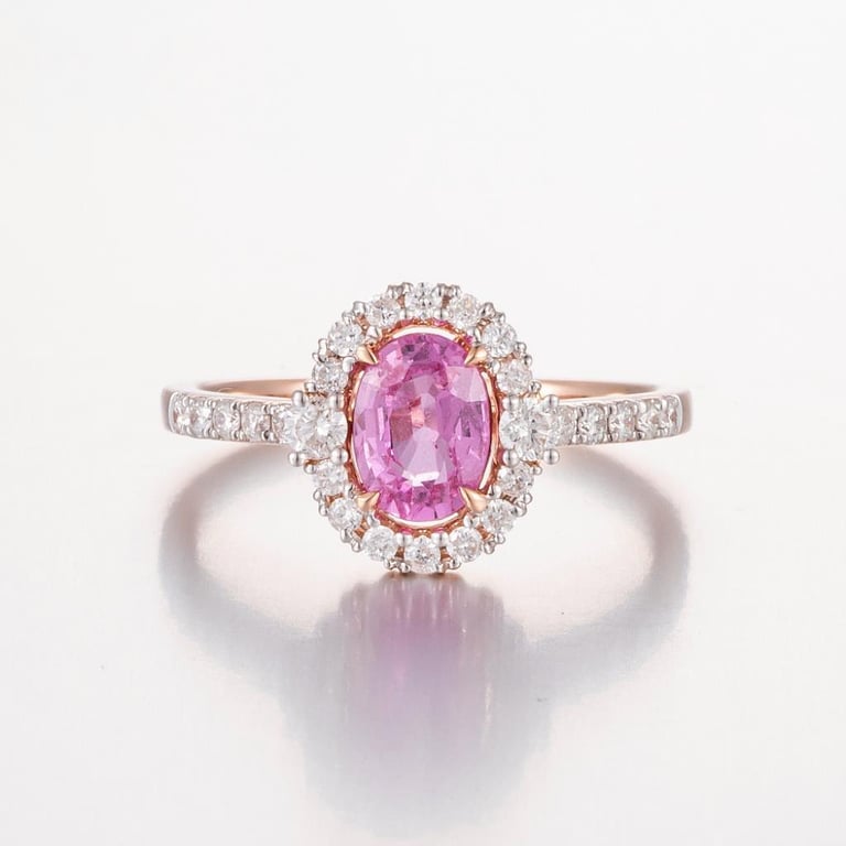 14CT ROSE GOLD PINK CEYLON SAPPHIRE AND DIAMOND DRESS RING. Featuring Centre, One Oval Cut, Moderate Vivid Purple Pink Ceylon Sapphire (1.17Ct Slightly Included), Claw Set, With 26 Round Brilliant Cut Diamonds (0.40Ct Tdw, G-H Colour, Vs1-Vs2 Clarity), Bead Set. Ring Size O. Valuations Provided by an Independent Third-Party Professional Not Directly Associated With Lloyds Auctions at AUD $20000This valuation has been conducted by an independent third-party professional. The valuation amount is an assessment by the issuing valuer and does not reflect the auction value of the item. Any inquiries regarding the valuation should be directed to the issuing valuer (refer to contact details on the certificate), as Lloyds Auctions has no affiliation or influence over the valuation, the valuer, or the stated amount. Condition: Good - Refer Images 0586156+455