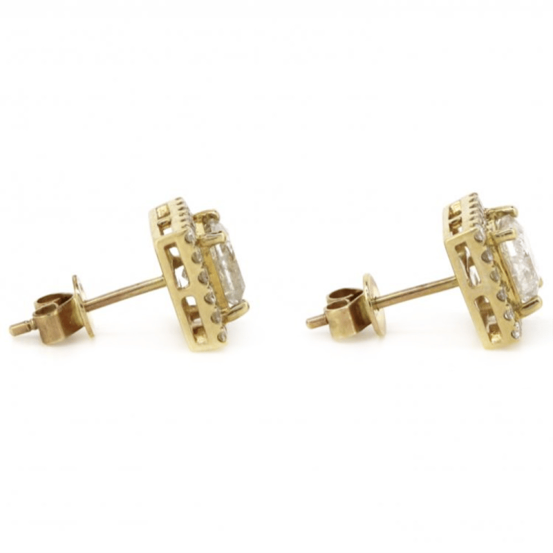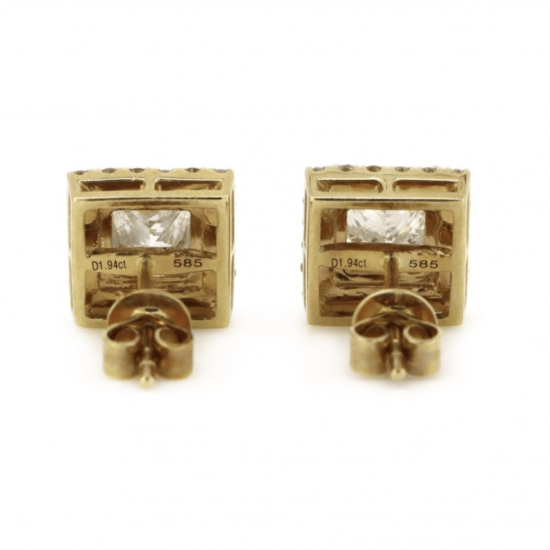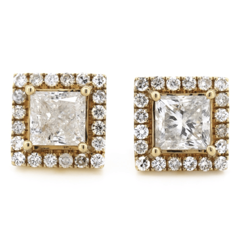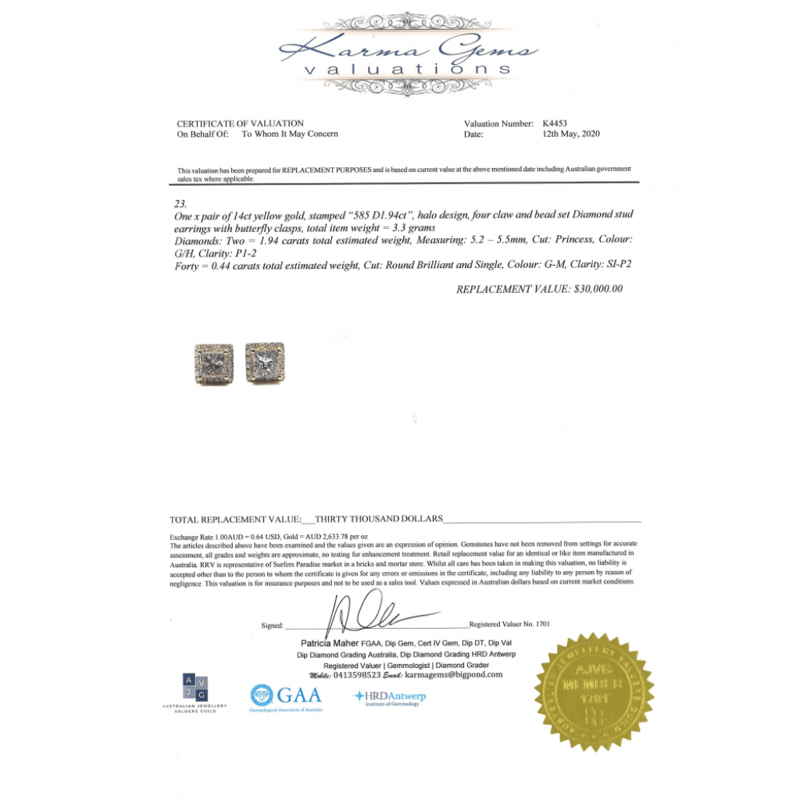 14K YELLOW GOLD AND DIAMOND, HALO STUD EARRINGS. The Centres Feature, 2 Princess Cut, Diamonds (1.94Ct Tdw, G-H Colour, P1-P2 Clarity), 4 Claw Set. Surrounding The Centres In Halos Are, 40 Round Brilliant Cut, Diamonds (0.44Ct Tdw, G-M Colour, Si-P2 Clarity), Bead Set. The Earrings Have Post Backs, With 14K Yellow Gold Butterfly Clasps. 14K Yellow Gold And Diamond, Halo Stud Earrings. The Centres Feature, 2 Princess Cut, Diamonds (1.94Ct Tdw, G-H Colour, P1-P2 Clarity), 4 Claw Set. Surrounding The Centres In Halos Are, 40 Round Brilliant Cut, Diamonds (0.44Ct Tdw, G-M Colour, Si-P2 Clarity), Bead Set. The Earrings Have Post Backs, With 14K Yellow Gold Butterfly Clasps. Valuations Provided by an Independent Third-Party Professional Not Directly Associated With Lloyds Auctions at AUD $$30,000.00This valuation has been conducted by an independent third-party professional. The valuation amount is an assessment by the issuing valuer and does not reflect the auction value of the item. Any inquiries regarding the valuation should be directed to the issuing valuer (refer to contact details on the certificate), as Lloyds Auctions has no affiliation or influence over the valuation, the valuer, or the stated amount. Condition: Good - Refer Images 0645838+5371