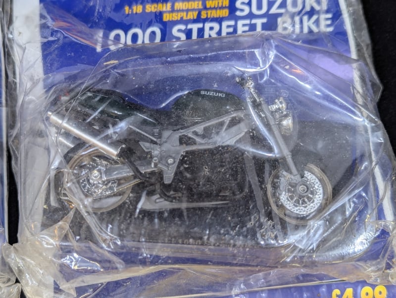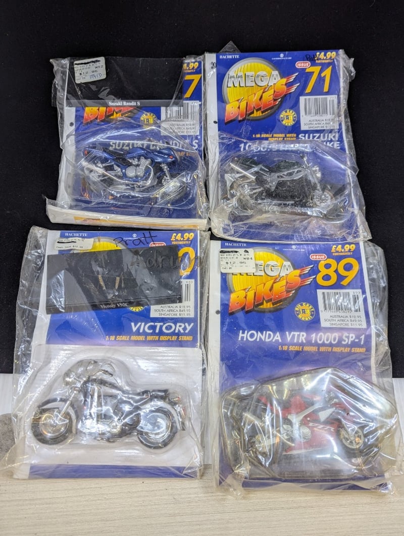 FOUR 1:18 SCALE MODEL MOTORBIKESBikes Includes: Honda Vtr 1000 Sp-1, Victory V92C, Suzuki Bandit S, Suzuki 1000 Street Bike584809+76