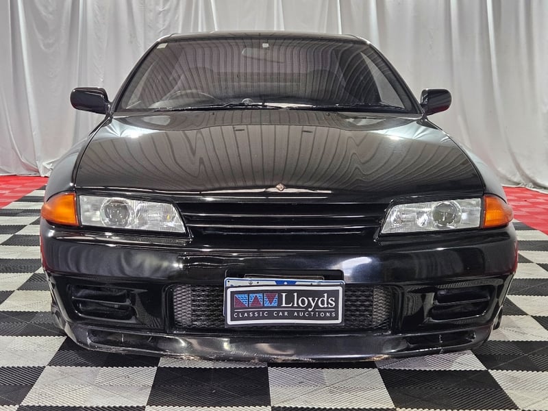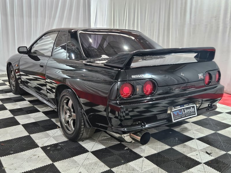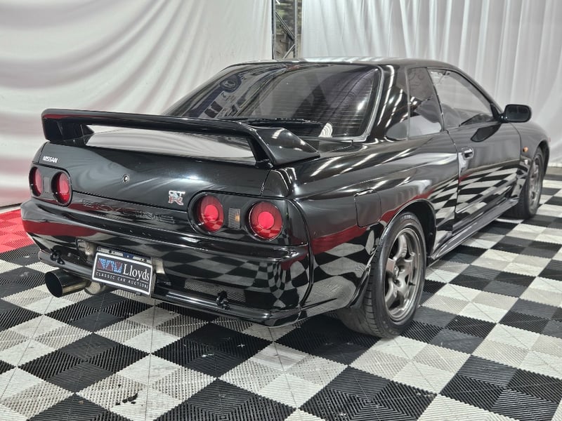 1993 Nissan Skyline R32 GT‑R two-door coupe finished in black. Rear-wheel drive–based ATTESA all-wheel-drive performance platform, powered by a 2.6‑litre inline six turbocharged petrol engine. Odometer indicating 126,554 kilometres.