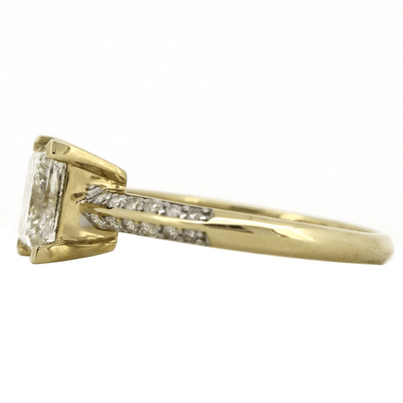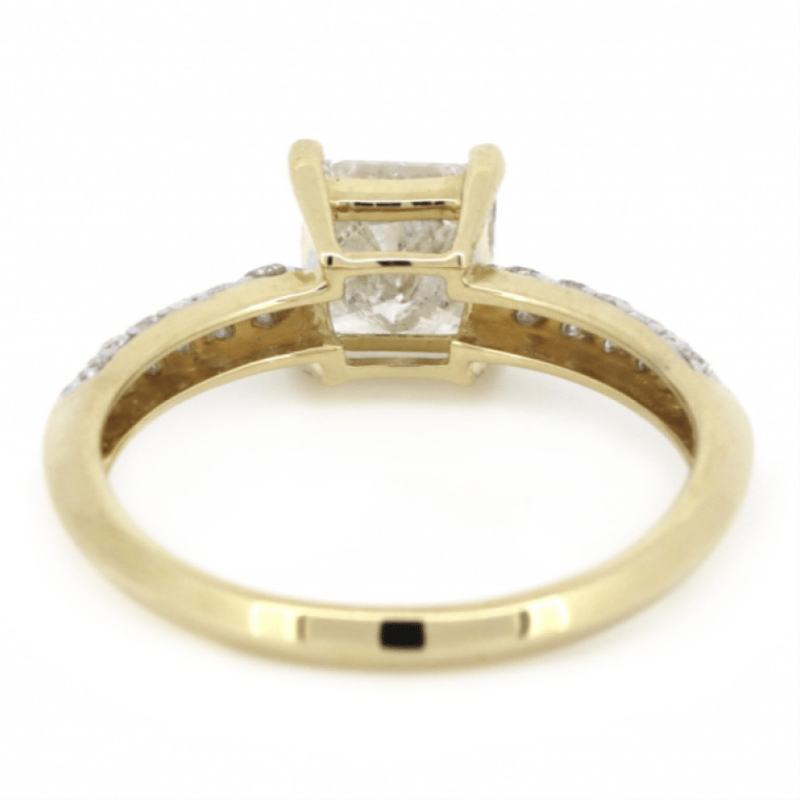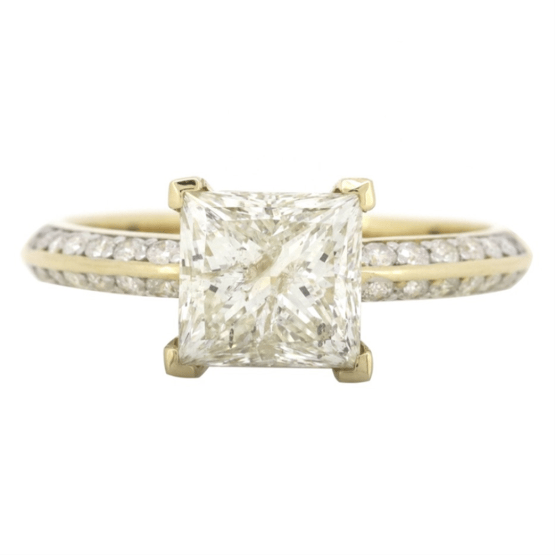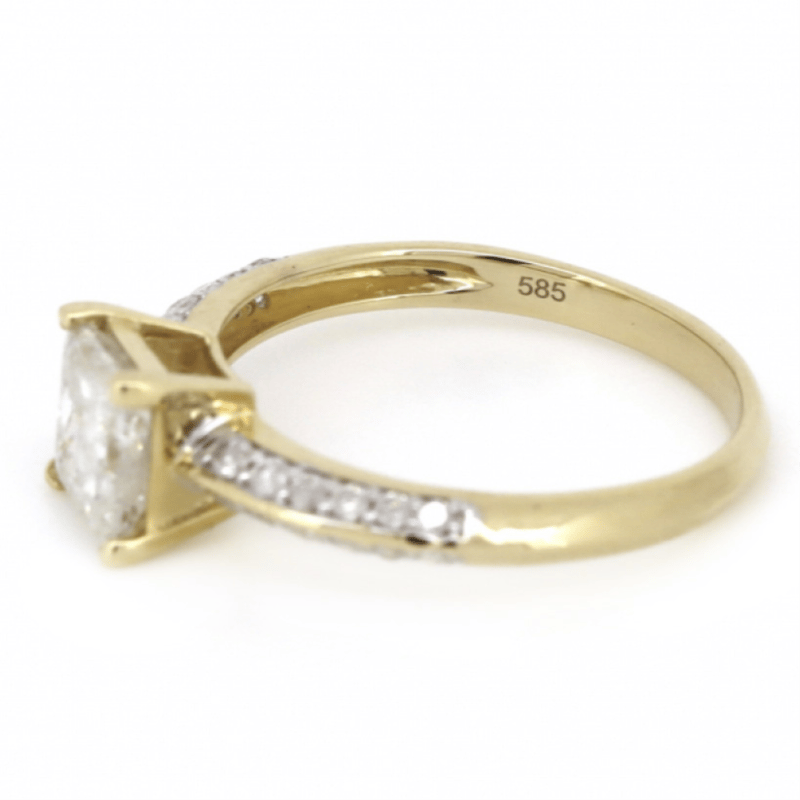 14K Yellow Gold, Yellow Diamond, Classic Ring. The Centre Features, One Square Princess Cut, Tinted Light Yellow, Diamond (1.20Ct, L-M Colour, P2-P3 Clarity), 4 Claw Set. Decorating The Band Are, 27 Round Brilliant Cut, Diamonds (0.24Ct Tdw, H-K Colour, P2+ Clarity), Bead Set. Ring Size M.