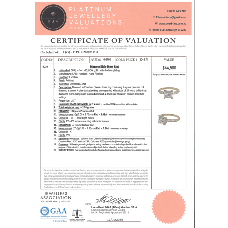 The Centre Features, One Square Princess Cut, Tinted Light Yellow, Diamond (1.20Ct, L-M Colour, P2-P3 Clarity), 4 Claw Set. Decorating The Band Are, 27 Round Brilliant Cut, Diamonds (0.24Ct Tdw, H-K Colour, P2+ Clarity), Bead Set. Ring Size M.