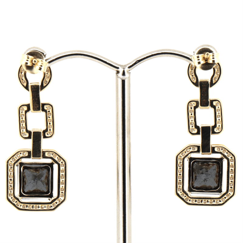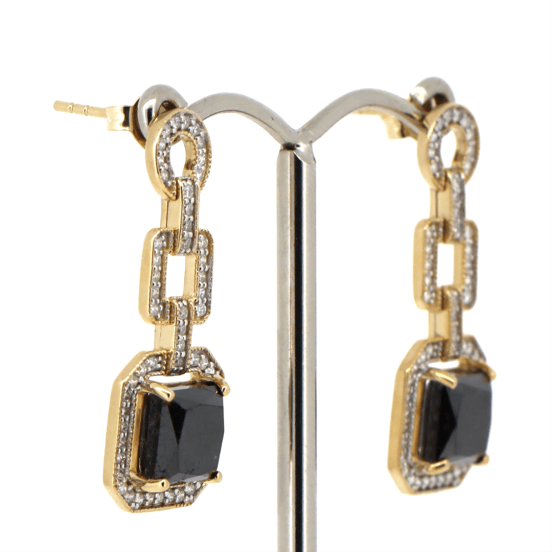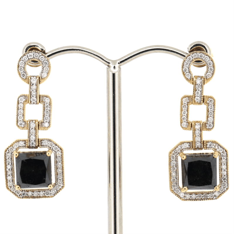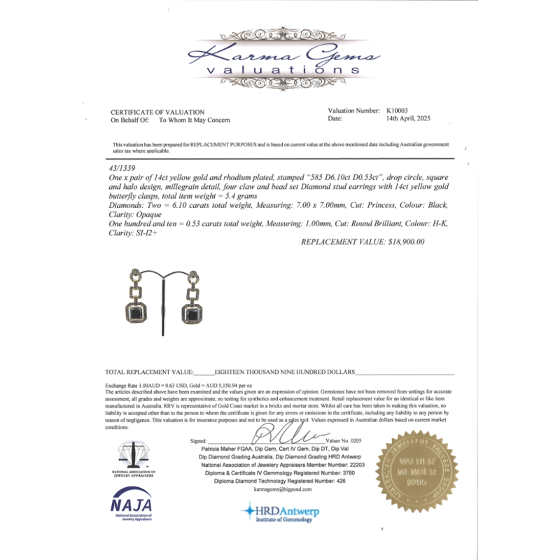 14K YELLOW GOLD, BLACK DIAMOND AND DIAMOND, DROP EARRINGS. The Design Features, 2 Princess Cut, Black, Diamonds (6.10Ct Tsw, Opaque Clarity), 4 Claw Set. Accompanying The Design Are, 110 Round Brilliant Cut, Diamonds (0.53Ct Tdw, H-K Colour, Si-I2+ Clarity), Bead Set In White Gold. The Earrings Have Post Backs, With 14K Yellow Gold Butterfly Clasps. 14K Yellow Gold, Black Diamond And Diamond, Drop Earrings. The Design Features, 2 Princess Cut, Black, Diamonds (6.10Ct Tsw, Opaque Clarity), 4 Claw Set. Accompanying The Design Are, 110 Round Brilliant Cut, Diamonds (0.53Ct Tdw, H-K Colour, Si-I2+ Clarity), Bead Set In White Gold. The Earrings Have Post Backs, With 14K Yellow Gold Butterfly Clasps. Valuations Provided by an Independent Third-Party Professional Not Directly Associated With Lloyds Auctions at AUD $$18,900.00This valuation has been conducted by an independent third-party professional. The valuation amount is an assessment by the issuing valuer and does not reflect the auction value of the item. Any inquiries regarding the valuation should be directed to the issuing valuer (refer to contact details on the certificate), as Lloyds Auctions has no affiliation or influence over the valuation, the valuer, or the stated amount. Condition: Good - Refer Images 0645838+5343