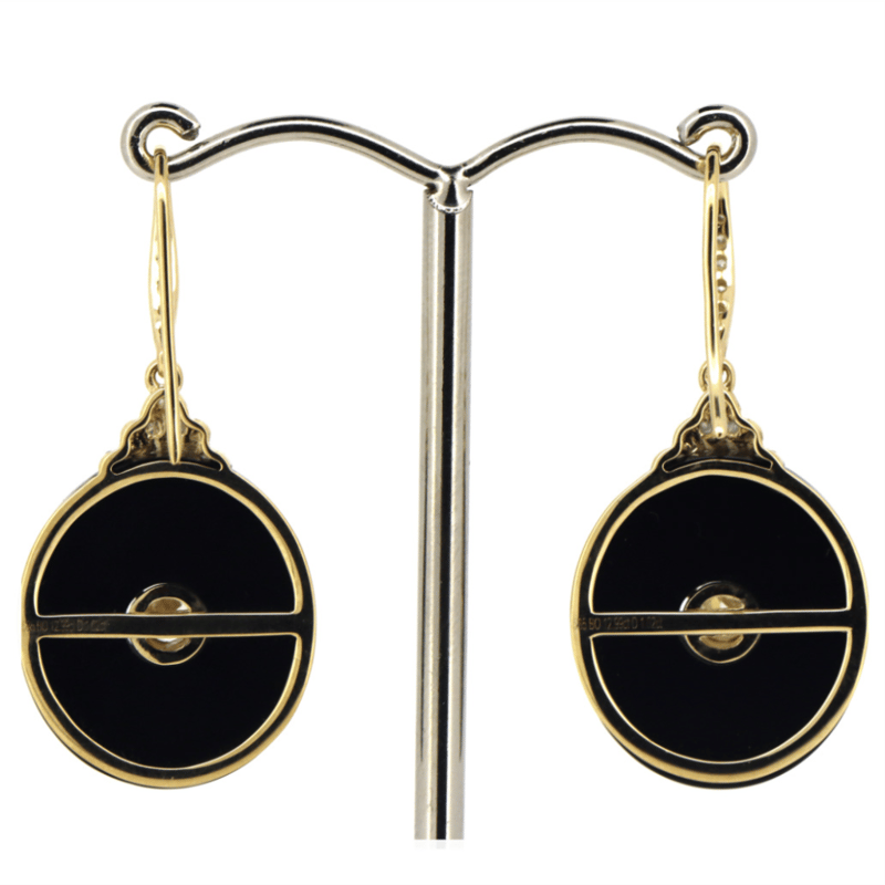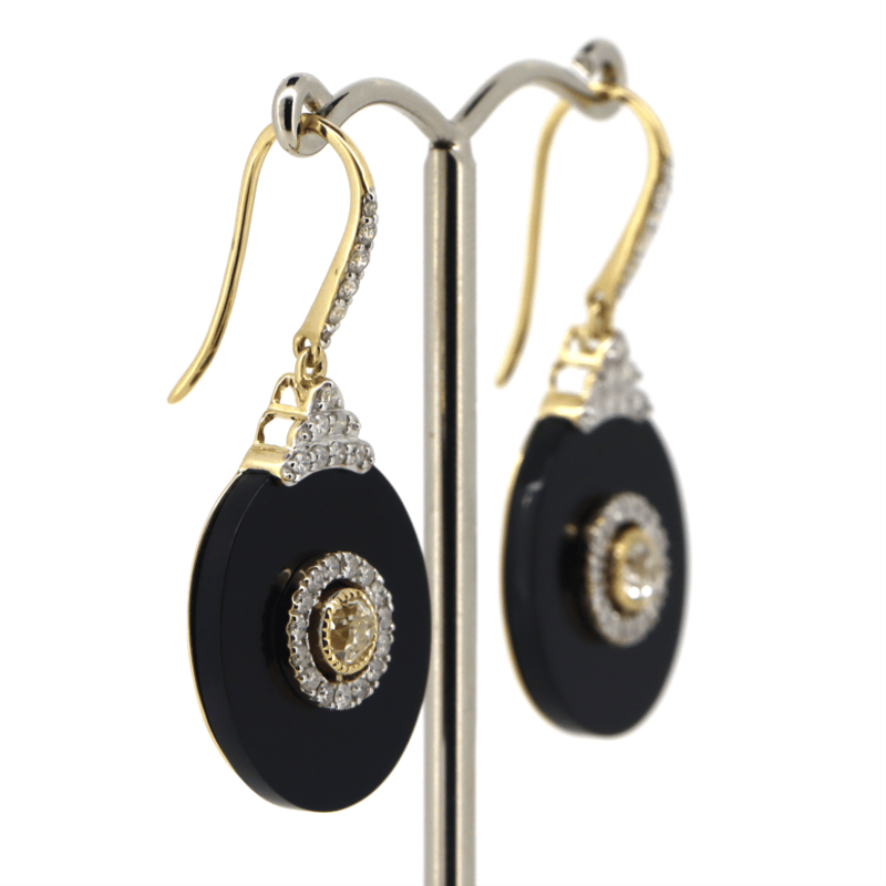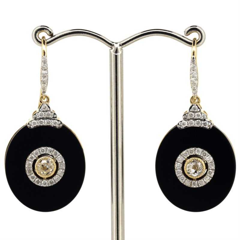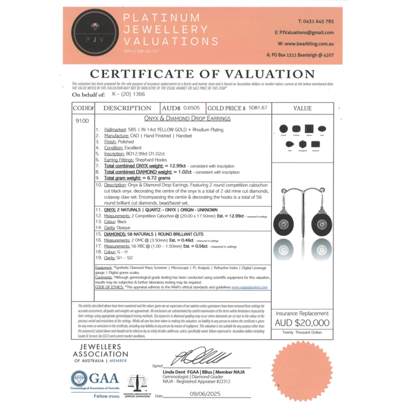 14K YELLOW GOLD, ONYX AND DIAMOND, DROP EARRINGS. The Design Features, 2 Competition Oval Cuts, Black, Onyx (12.99Ct Tsw, Opaque). Centring The Onyx Are 2 Old Mine Cut, Diamonds (0.46Ct Tdw, G-H Colour, Si1-Si2 Clarity), Cutaway Claw Set. Encompassing The Centre And Decorating The Hooks Are, 56 Round Brilliant Cut, Diamonds (0.56Ct Tdw, G-H Colour, Si1-Si2 Clarity), Bead/Bezel Set. The Earrings Feature Shepherd Hooks. 14K Yellow Gold, Onyx And Diamond, Drop Earrings. The Design Features, 2 Competition Oval Cuts, Black, Onyx (12.99Ct Tsw, Opaque). Centring The Onyx Are 2 Old Mine Cut, Diamonds (0.46Ct Tdw, G-H Colour, Si1-Si2 Clarity), Cutaway Claw Set. Encompassing The Centre And Decorating The Hooks Are, 56 Round Brilliant Cut, Diamonds (0.56Ct Tdw, G-H Colour, Si1-Si2 Clarity), Bead/Bezel Set. The Earrings Feature Shepherd Hooks. Valuations Provided by an Independent Third-Party Professional Not Directly Associated With Lloyds Auctions at AUD $$20,000.00This valuation has been conducted by an independent third-party professional. The valuation amount is an assessment by the issuing valuer and does not reflect the auction value of the item. Any inquiries regarding the valuation should be directed to the issuing valuer (refer to contact details on the certificate), as Lloyds Auctions has no affiliation or influence over the valuation, the valuer, or the stated amount. Condition: Good - Refer Images 0645838+5367