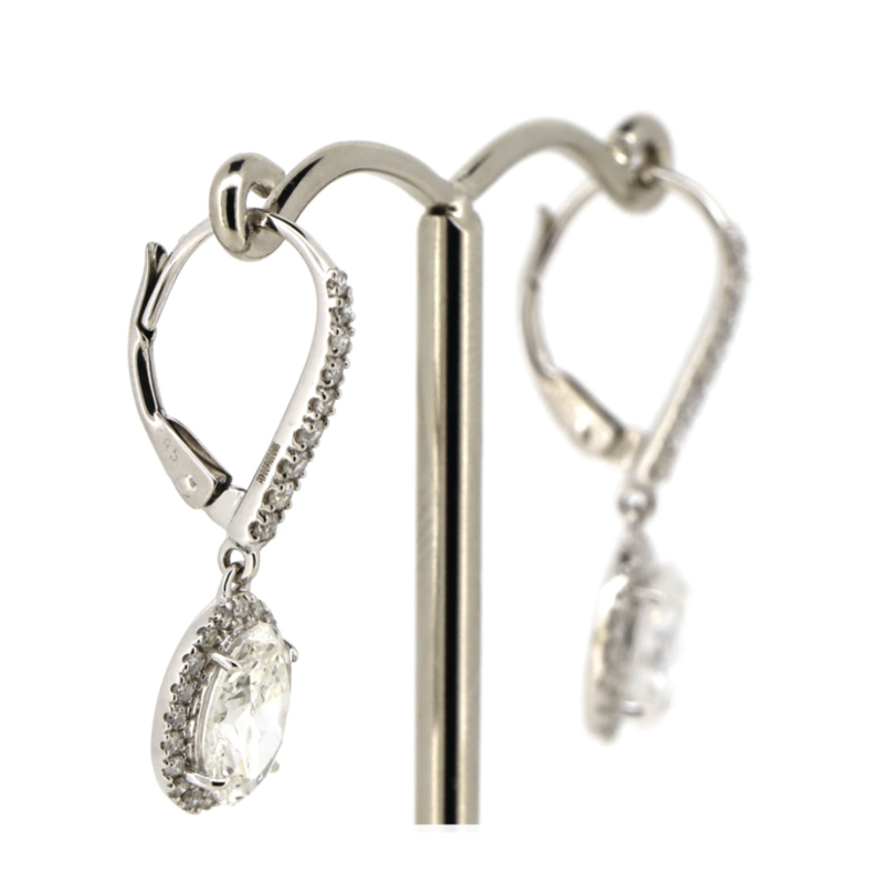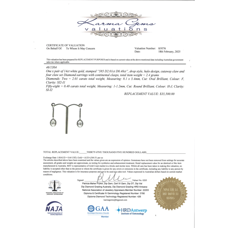 14K WHITE GOLD AND DIAMOND, HALO DROP EARRINGS. The Design Features, 2 Round Brilliant Cut, Diamonds (2.010Ct Tdw, F Colour, Si-I2 Clarity), Claw Set. Surrounding The Centres In A Halo And Decorating The Hooks Are, 58 Round Brilliant Cut, Diamonds (0.40Ct Tdw, H-J Colour, Si2-P2 Clarity), Micro-Claw Set. Earrings Have Lever Back Closures. 14K White Gold And Diamond, Halo Drop Earrings. The Design Features, 2 Round Brilliant Cut, Diamonds (2.010Ct Tdw, F Colour, Si-I2 Clarity), Claw Set. Surrounding The Centres In A Halo And Decorating The Hooks Are, 58 Round Brilliant Cut, Diamonds (0.40Ct Tdw, H-J Colour, Si2-P2 Clarity), Micro-Claw Set. Earrings Have Lever Back Closures. Valuations Provided by an Independent Third-Party Professional Not Directly Associated With Lloyds Auctions at AUD $$35,500.00This valuation has been conducted by an independent third-party professional. The valuation amount is an assessment by the issuing valuer and does not reflect the auction value of the item. Any inquiries regarding the valuation should be directed to the issuing valuer (refer to contact details on the certificate), as Lloyds Auctions has no affiliation or influence over the valuation, the valuer, or the stated amount. Condition: Good - Refer Images 0645838+5315