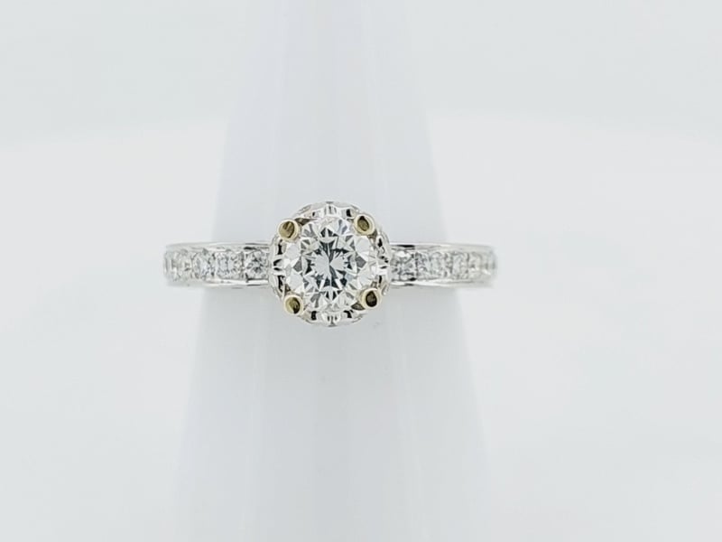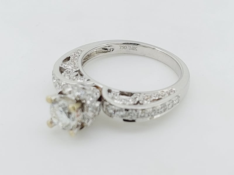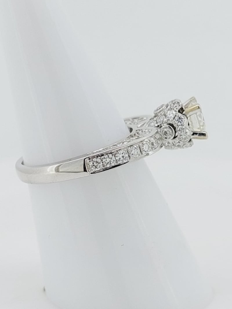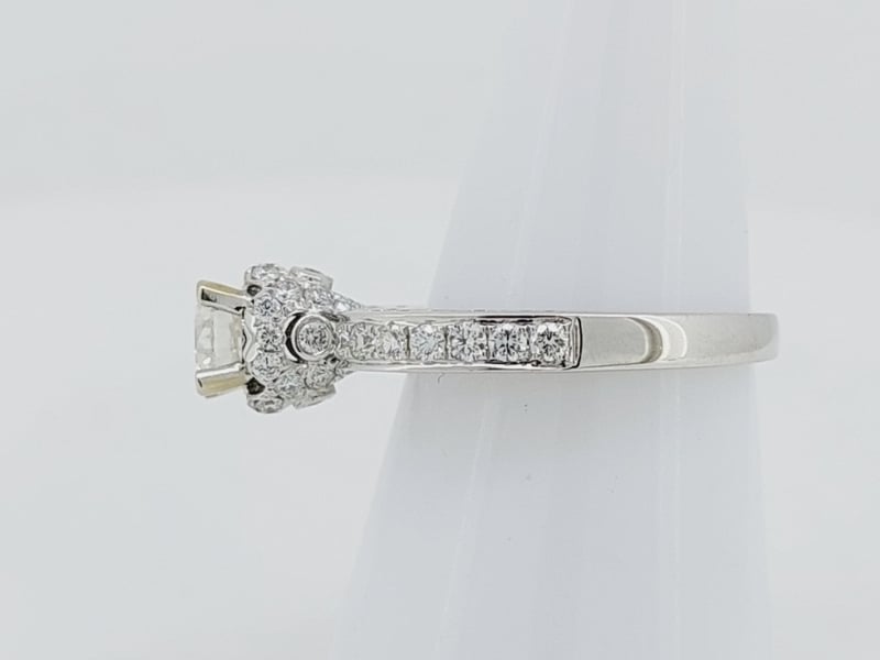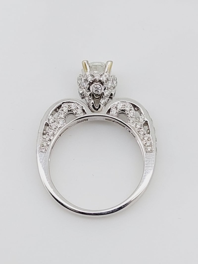 The Diamond Set Crown Has One Round Brilliant Cut Diamond, Four Claw Set With Four Round Brilliant Cut Diamonds Bezel Set Around The Centre Of The Crown And Twenty Two Round Brilliant Cut Diamonds Grain Set. The Diamond Set Crown Meets The Raised Diamond Set Shoulders On A Half Round Ring. Size M