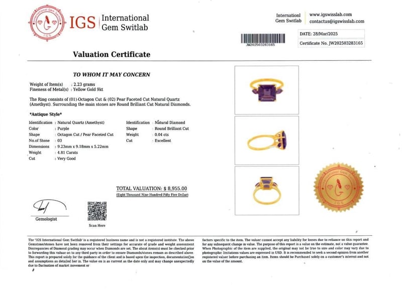 9CT YELLOW GOLD AMETHYST AND DIAMOND RING Valuations Provided by an Independent Third-Party Professional Not Directly Associated With Lloyds Auctions at AUD $8955 This valuation has been conducted by an independent third-party professional. The valuation amount is an assessment by the issuing valuer and does not reflect the auction value of the item. Any inquiries regarding the valuation should be directed to the issuing valuer (refer to contact details on the certificate), as Lloyds Auctions has no affiliation or influence over the valuation, the valuer, or the stated amount. Condition: Good - Refer Images 0 +283165