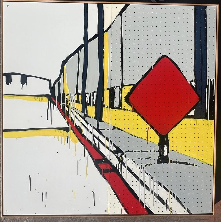 JASPER KNIGHT (1960 - ) Original Mixed Media Title: Pavement Stop Sign Frame Size: 122cm x 122cm Condition: Good - Refer To Images Artwork Is Framed And Ready To Hang Crossdock 162966+6