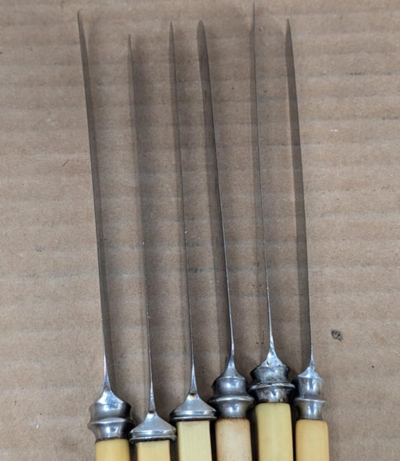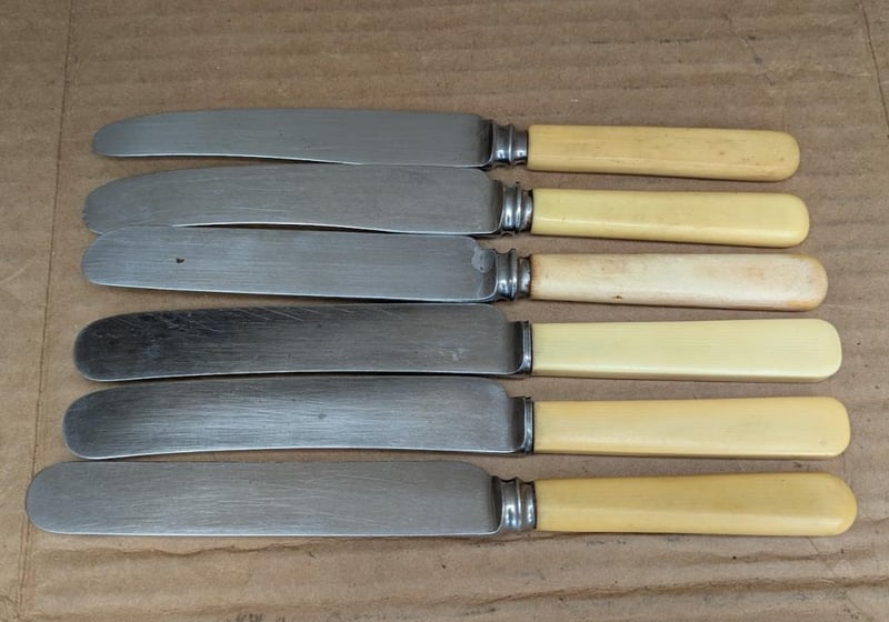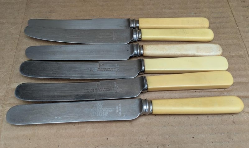VINTAGE BREAD AND BUTTER KNIVES BONE HANDLE SHEFFIELD FIRTH BREARLEY STAINLESS ENGLAND QTY 6 586118+8