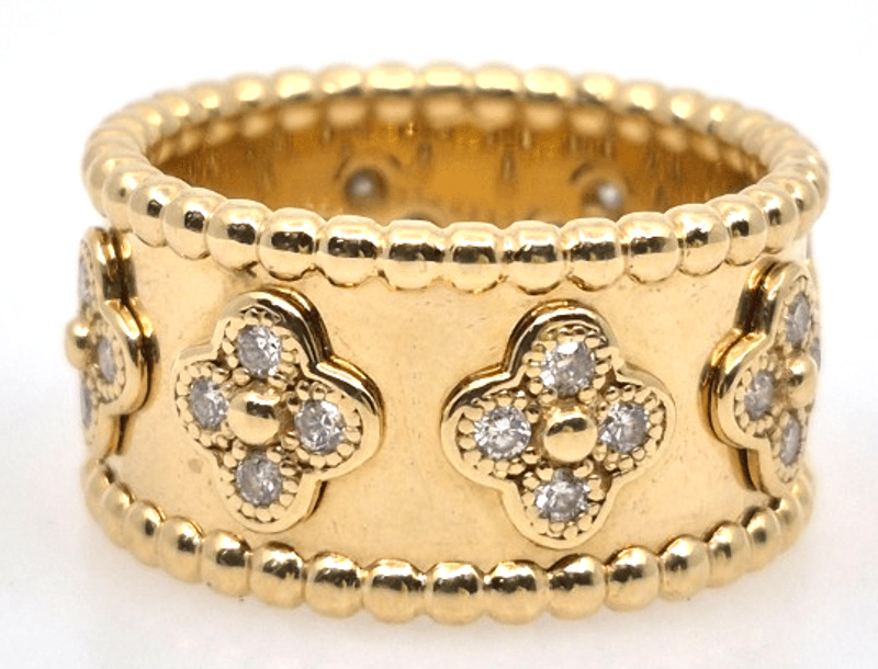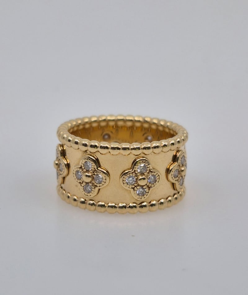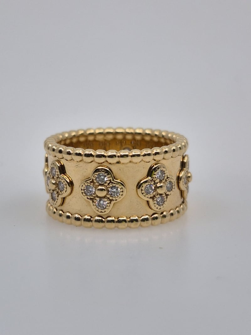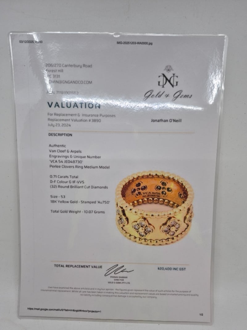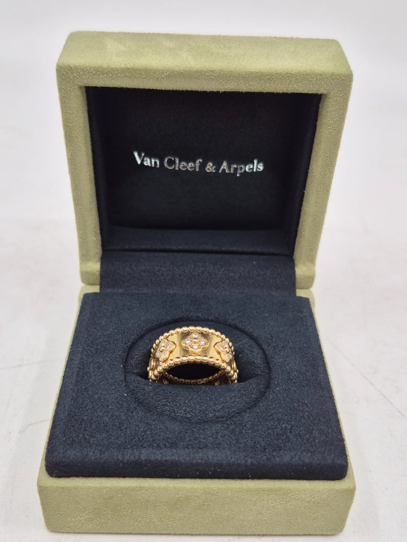 18K YELLOW GOLD, DIAMOND VAN CLEEF & ARPELS PERLEE CLOVERS RING MEDIUM MODEL Complete With Valuation Certificate Total Item Weight: 10.05g Markings: Vca 54 Je048730 Condition: Good - Refer To Images This valuation has been conducted by an independent third-party professional. The valuation amount is an assessment by the issuing valuer and does not reflect the auction value of the item. Any inquiries regarding the valuation should be directed to the issuing valuer (refer to contact details on the certificate), as Lloyds Auctions has no affiliation or influence over the valuation, the valuer, or the stated amount. Insurance Replacement Valuation Amount: $20,400.00 VAULT 586287+1