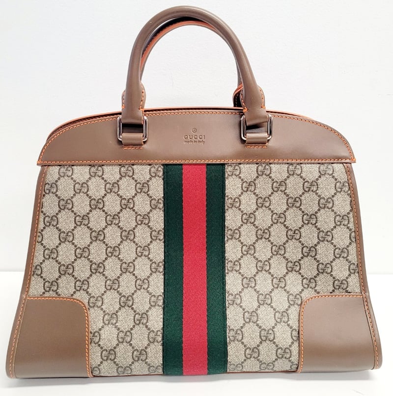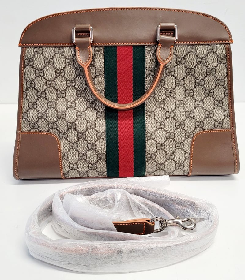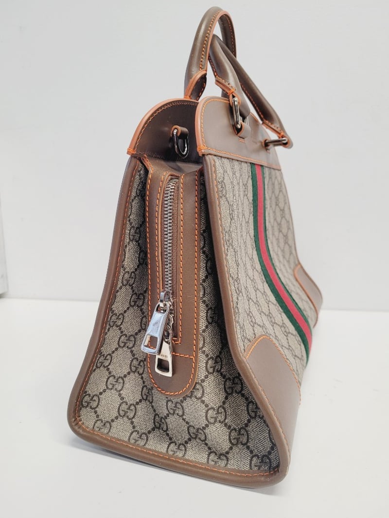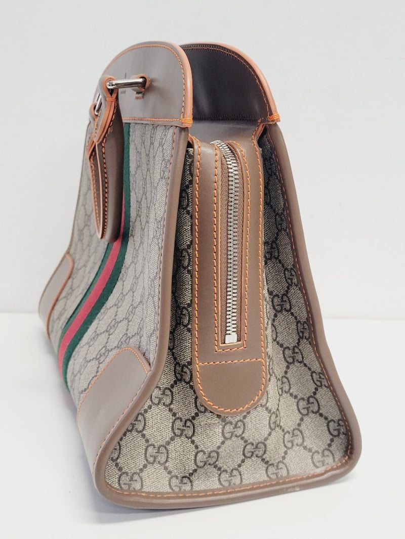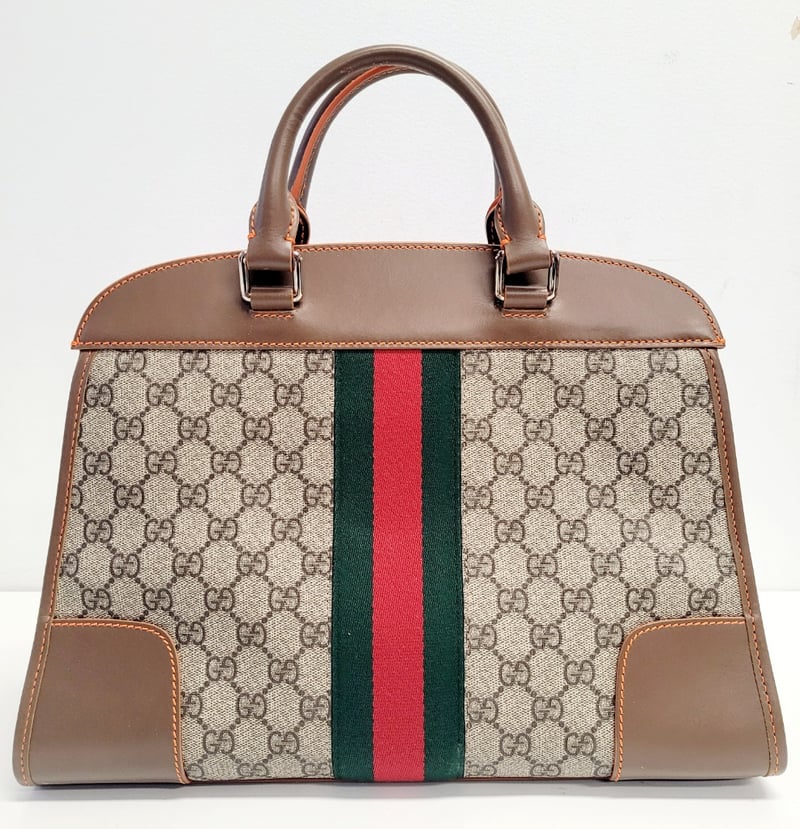 GUCCI GG SUPREME DUFFLE TOTE WITH BROWN LEATHER TRIM AND A GREEN AND RED WEB STRIPE Item Size: Height: 27cm, Width: 35cm, Depth: 16cm Includes Shoulder Strap Condition: Good - Refer To Images 488390+1