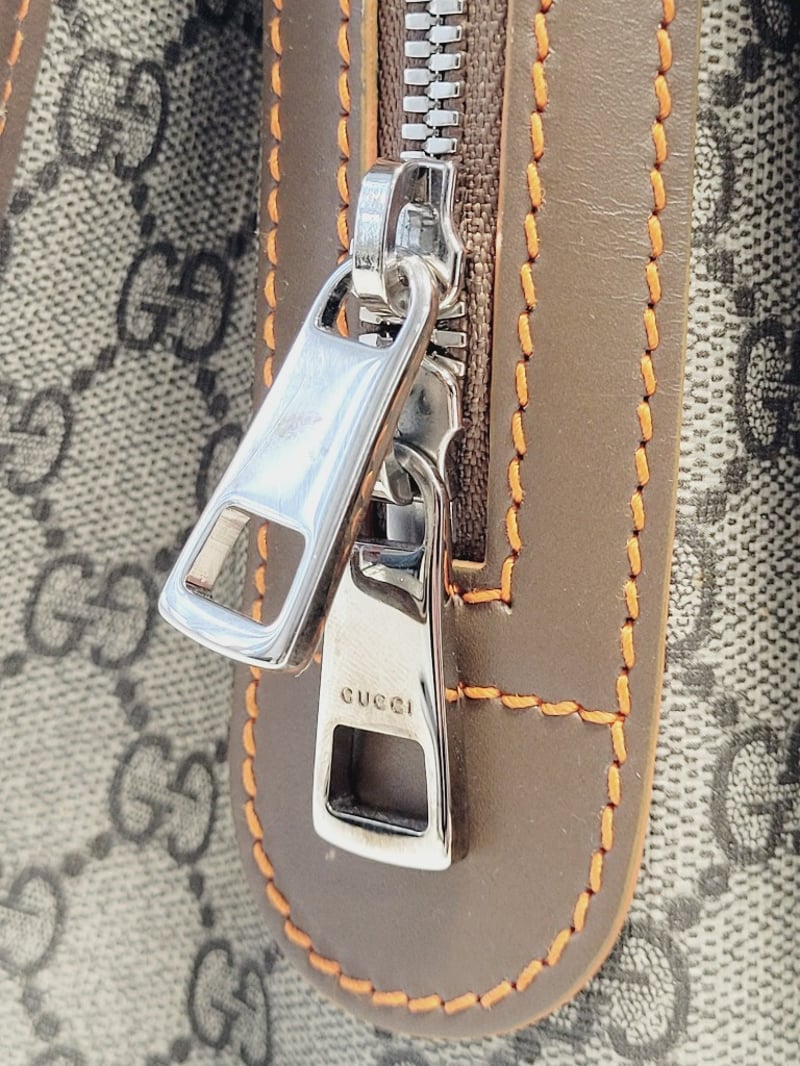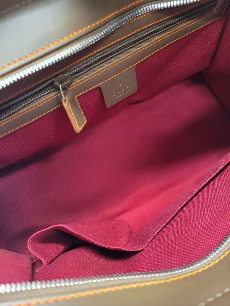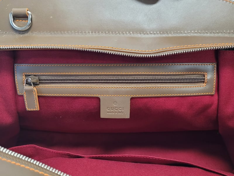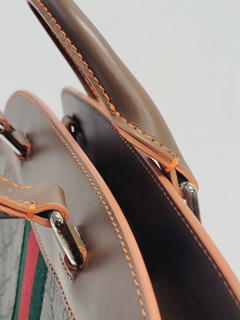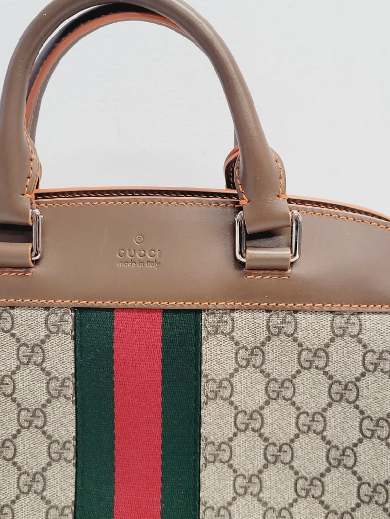 GUCCI GG SUPREME DUFFLE TOTE WITH BROWN LEATHER TRIM AND A GREEN AND RED WEB STRIPE Item Size: Height: 27cm, Width: 35cm, Depth: 16cm Includes Shoulder Strap Condition: Good - Refer To Images 488390+1