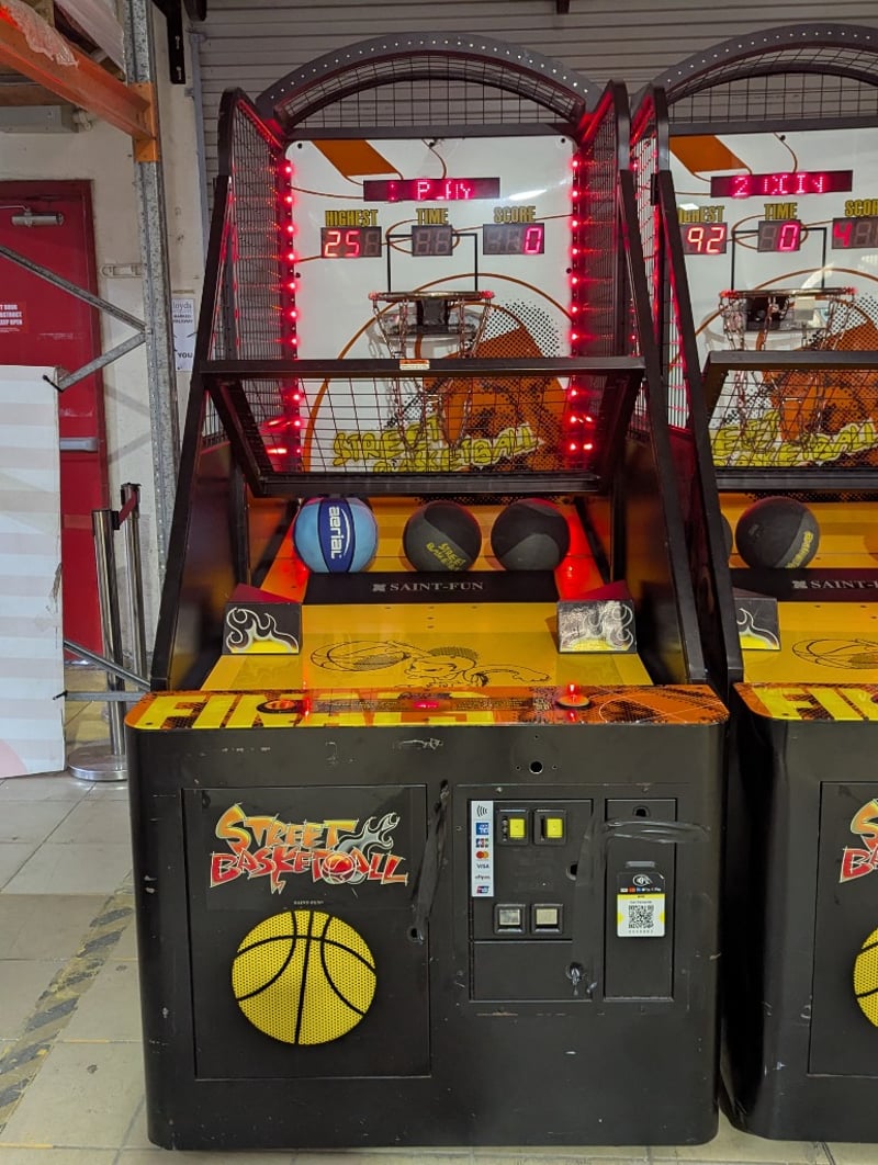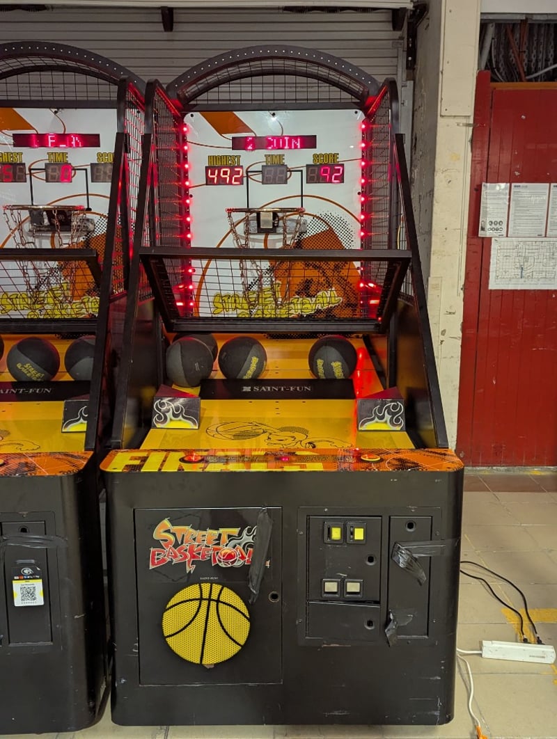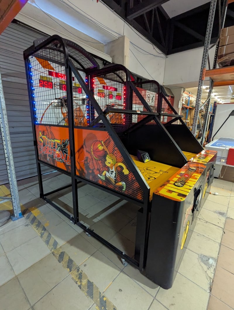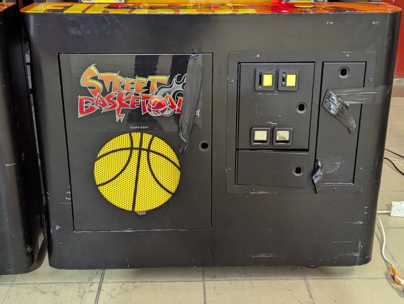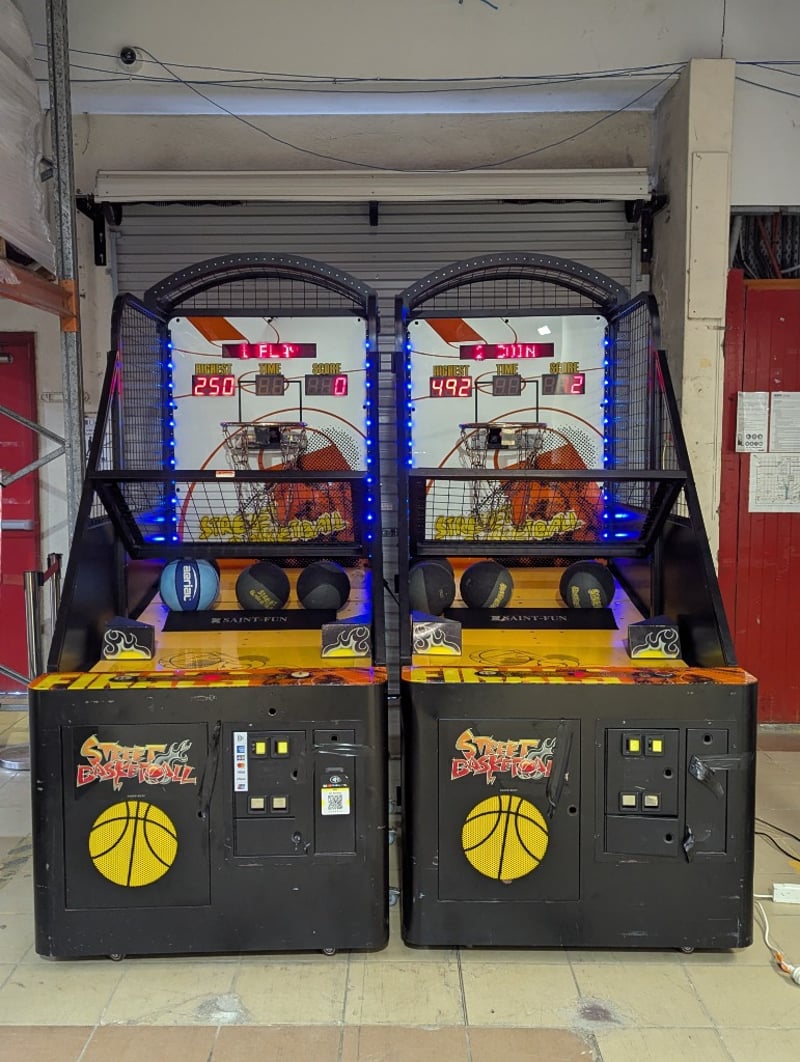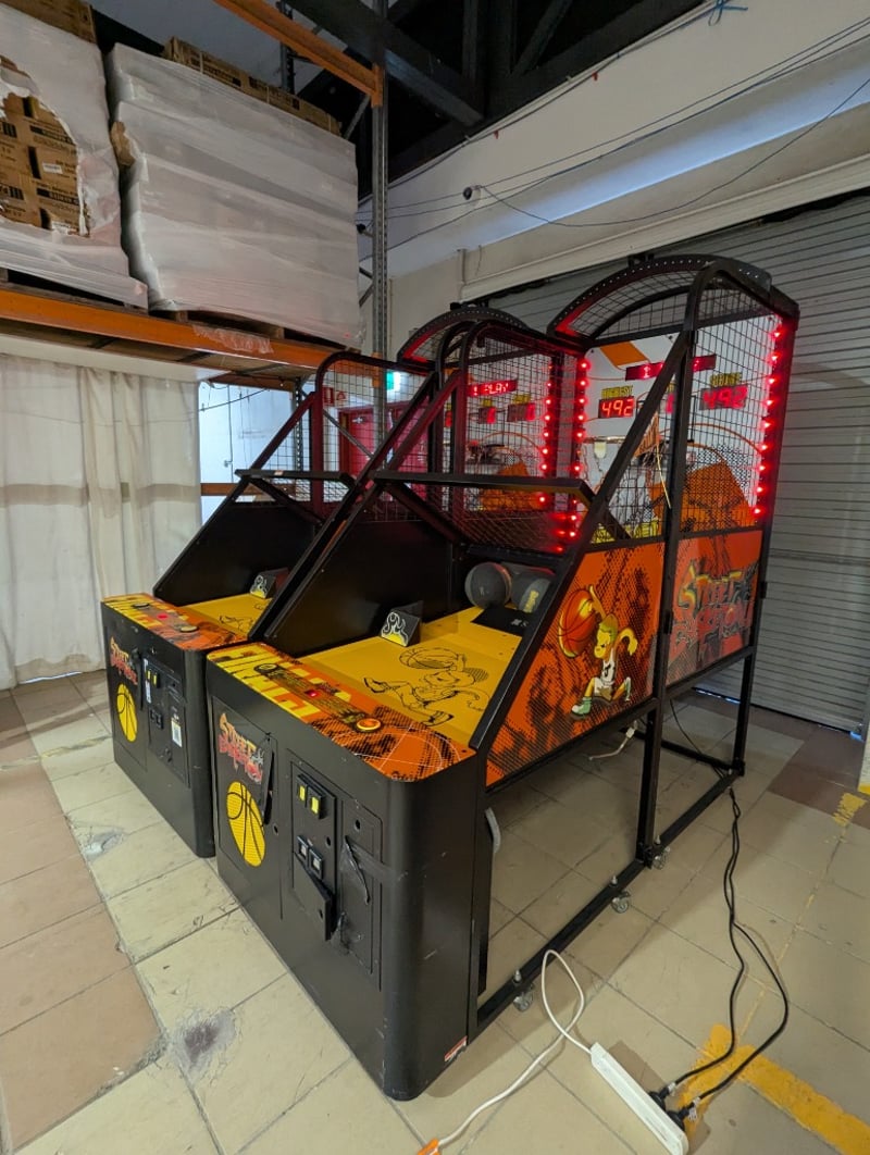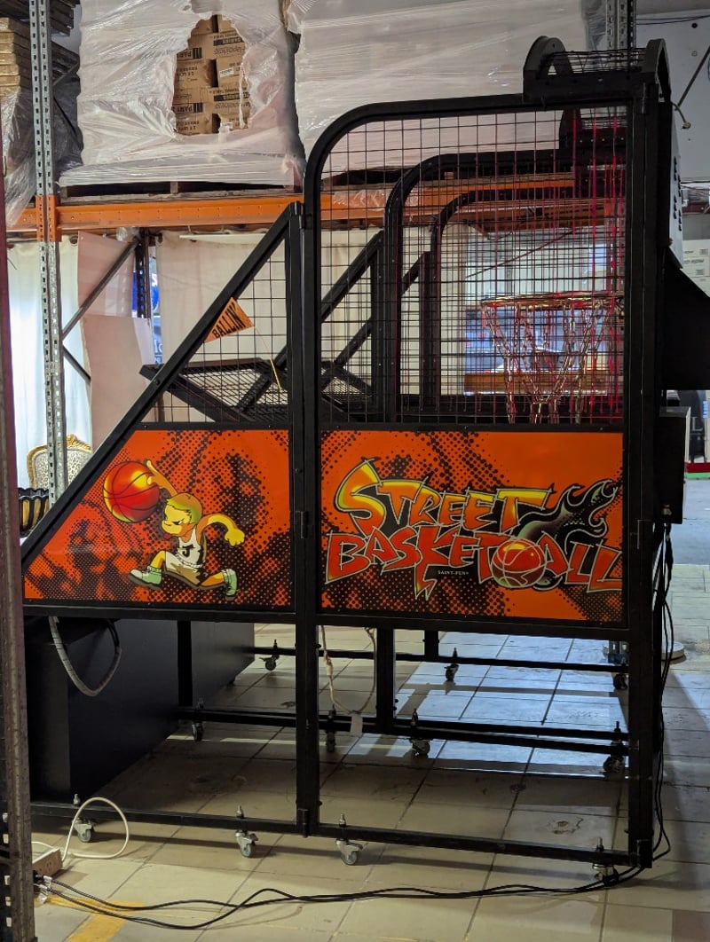 Arcade Machine, Street Basketball Model: Street Basketball Serial #: unknown Manufacturer: Saint-Fun Key Mechanisms Removed Machine powers up and works, basket sensor on 1 not working. General wear and tear Dimensions each: H 225cm x W 101cm x D 200cm NOTE: 2 x Machines, SOLD AS LOT