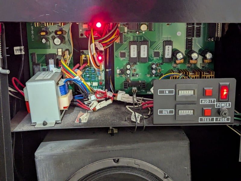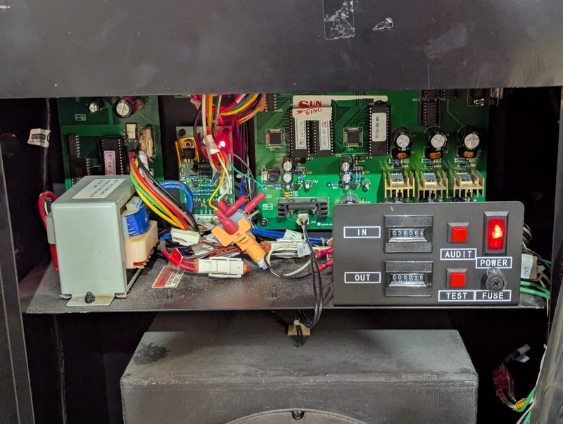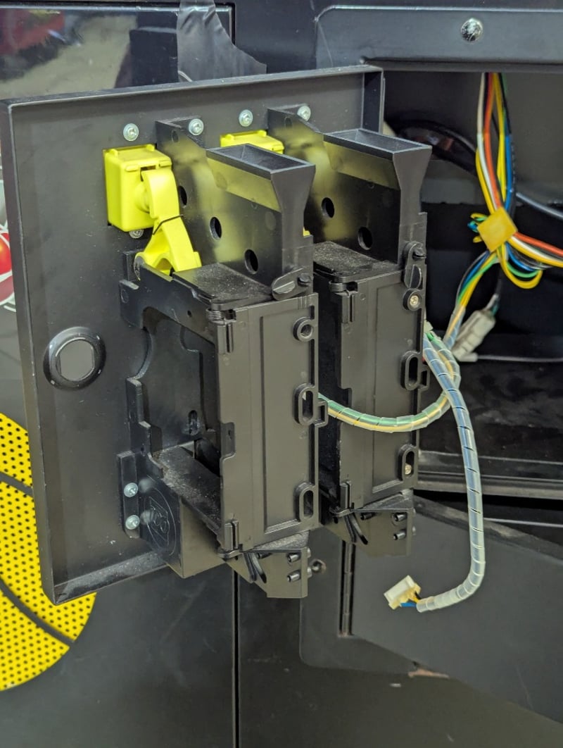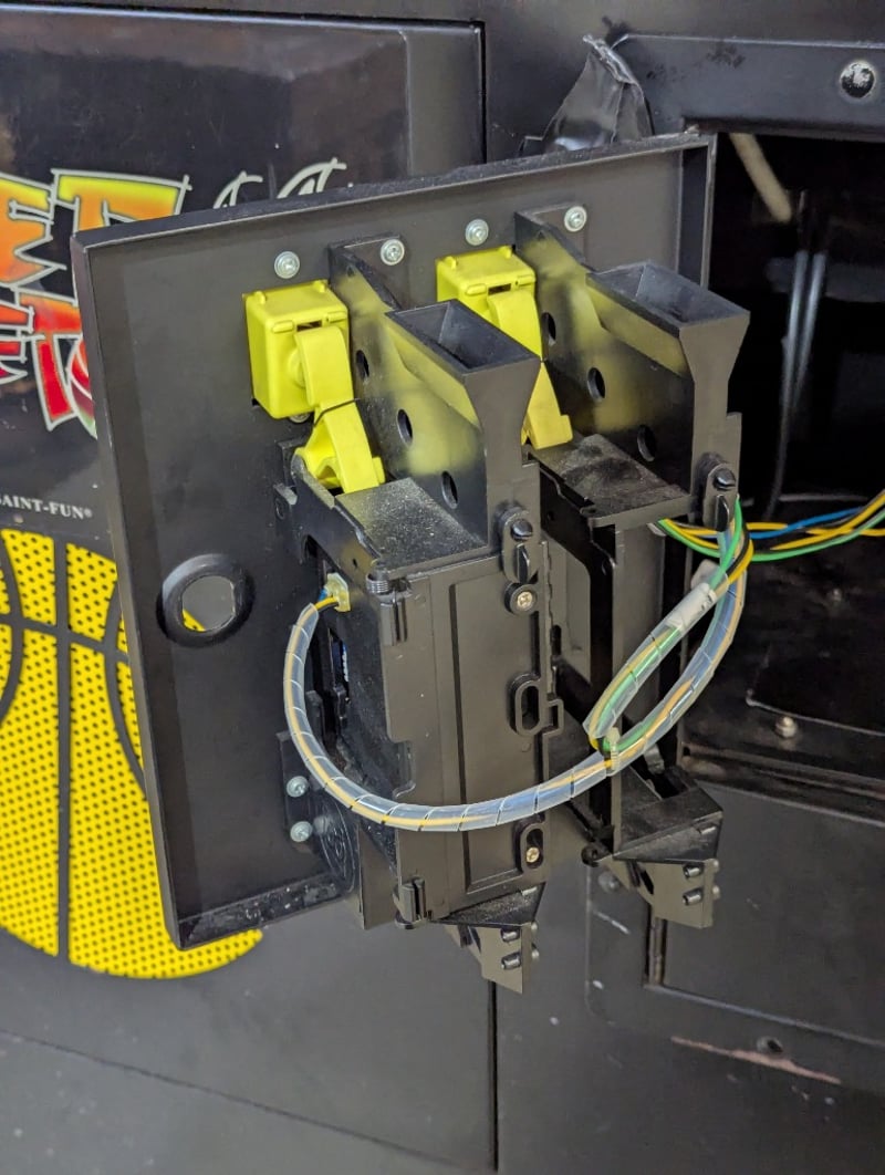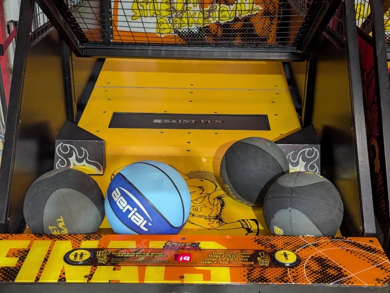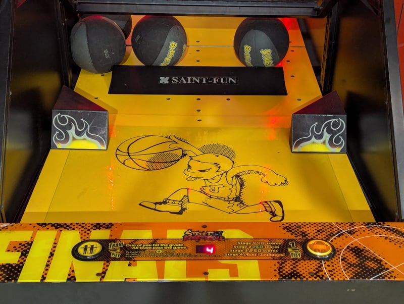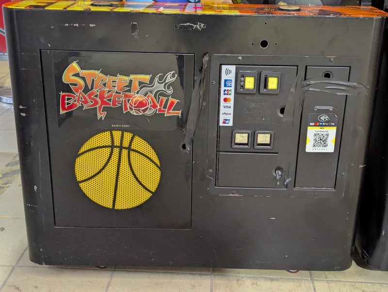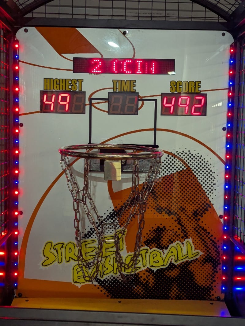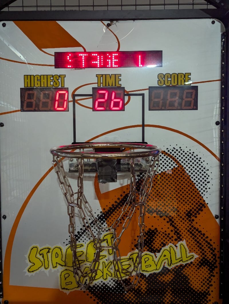 Arcade Machine, Street Basketball Model: Street Basketball Serial #: unknown Manufacturer: Saint-Fun Key Mechanisms Removed Machine powers up and works, basket sensor on 1 not working. General wear and tear Dimensions each: H 225cm x W 101cm x D 200cm NOTE: 2 x Machines, SOLD AS LOT