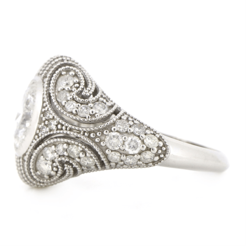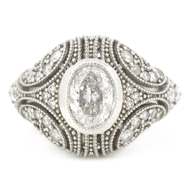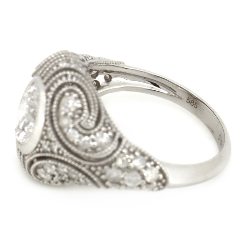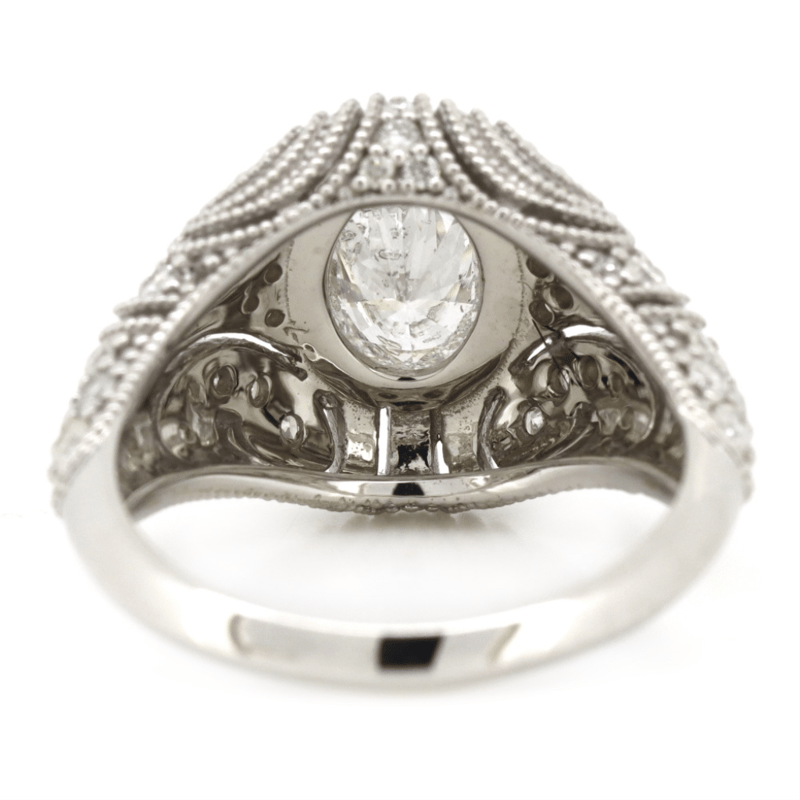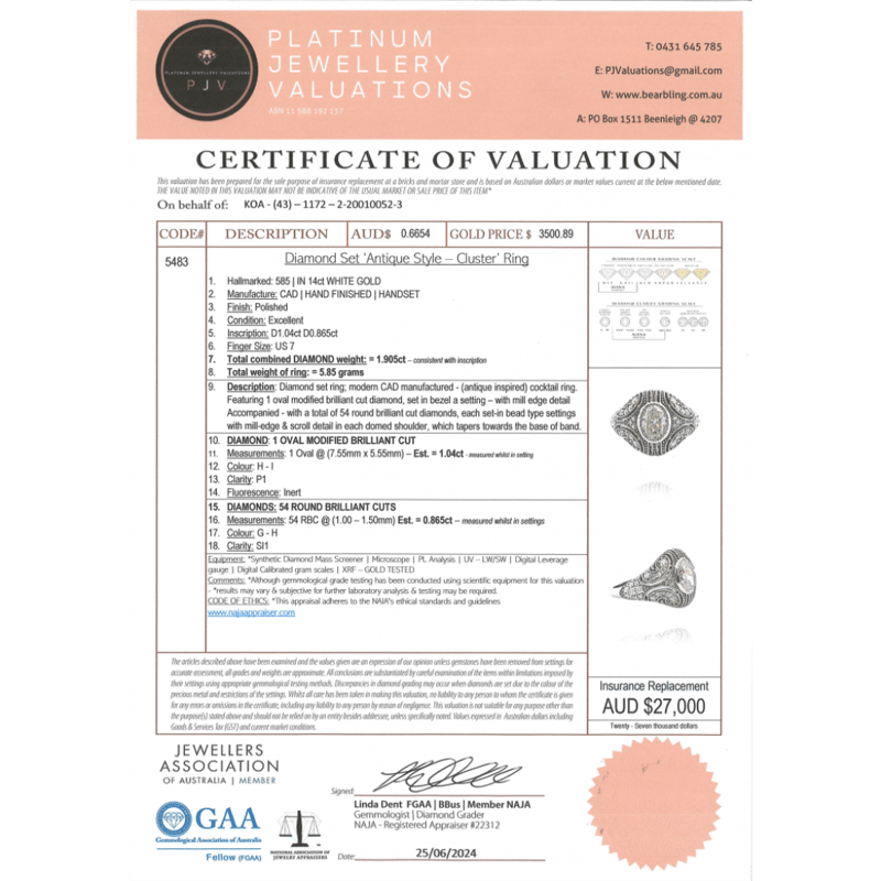 14K WHITE GOLD AND DIAMOND, CLUSTER RING. The Centre Features, One Oval Modified Brilliant Cut, Diamond (1.04Ct, H-I Colour, P1 Clarity), Bezel Set. Decorating The Centre Are, 54 Round Brilliant Cut, Diamonds (0.865Ct Tdw, G-H Colour, Si1 Clarity), Bead Set. Ring Size N. 14K White Gold And Diamond, Cluster Ring. The Centre Features, One Oval Modified Brilliant Cut, Diamond (1.04Ct, H-I Colour, P1 Clarity), Bezel Set. Decorating The Centre Are, 54 Round Brilliant Cut, Diamonds (0.865Ct Tdw, G-H Colour, Si1 Clarity), Bead Set. Ring Size N. Valuations Provided by an Independent Third-Party Professional Not Directly Associated With Lloyds Auctions at AUD $$27,000.00This valuation has been conducted by an independent third-party professional. The valuation amount is an assessment by the issuing valuer and does not reflect the auction value of the item. Any inquiries regarding the valuation should be directed to the issuing valuer (refer to contact details on the certificate), as Lloyds Auctions has no affiliation or influence over the valuation, the valuer, or the stated amount. Condition: Good - Refer Images 0645838+5351