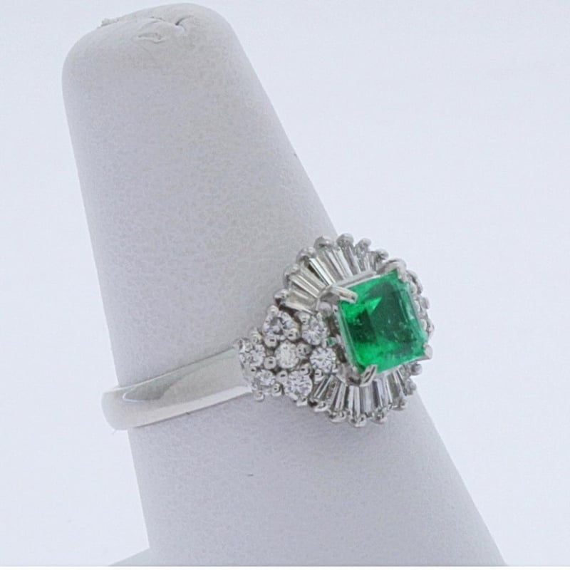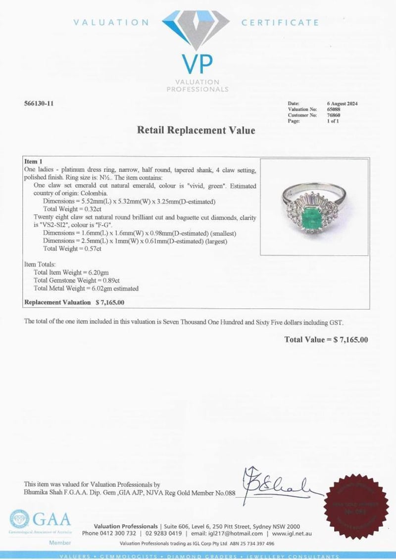 PLATINUM EMERALD AND DIAMOND DRESS RING Platinum Emerald And Diamond Dress Ring, Narrow, Half Round, Tapered Shank, 4 Claw Setting, Polished Finish. Ring Size Is: N½.. The Item Contains: One Claw Set Emerald Cut Natural Emerald, Colour Is "Vivid, Green". Estimated Country Of Origin: Colombia. Dimensions = 5.52Mm(L) X 5.32Mm(W) X 3.25Mm(D-Estimated) Total Weight = 0.32Ct Twenty Eight Claw Set Natural Round Brilliant Cut And Baguette Cut Diamonds, Clarity Is "Vs2-Si2", Colour Is "F-G". Dimensions = 1.6Mm(L) X 1.6Mm(W) X 0.98Mm(D-Estimated) (Smallest) Dimensions = 2.5Mm(L) X 1Mm(W) X 0.61Mm(D-Estimated) (Largest) Total Weight = 0.57Ct Item Totals: Total Item Weight = 6.20Gm Total Gemstone Weight = 0.89Ct Total Metal Weight = 6.02Gm Estimated Valuations Provided by an Independent Third-Party Professional Not Directly Associated With Lloyds Auctions at AUD $7165 This valuation has been conducted by an independent third-party professional. The valuation amount is an assessment by the issuing valuer and does not reflect the auction value of the item. Any inquiries regarding the valuation should be directed to the issuing valuer (refer to contact details on the certificate), as Lloyds Auctions has no affiliation or influence over the valuation, the valuer, or the stated amount. Condition: Good - Refer Images 0 160781+30