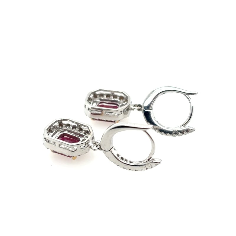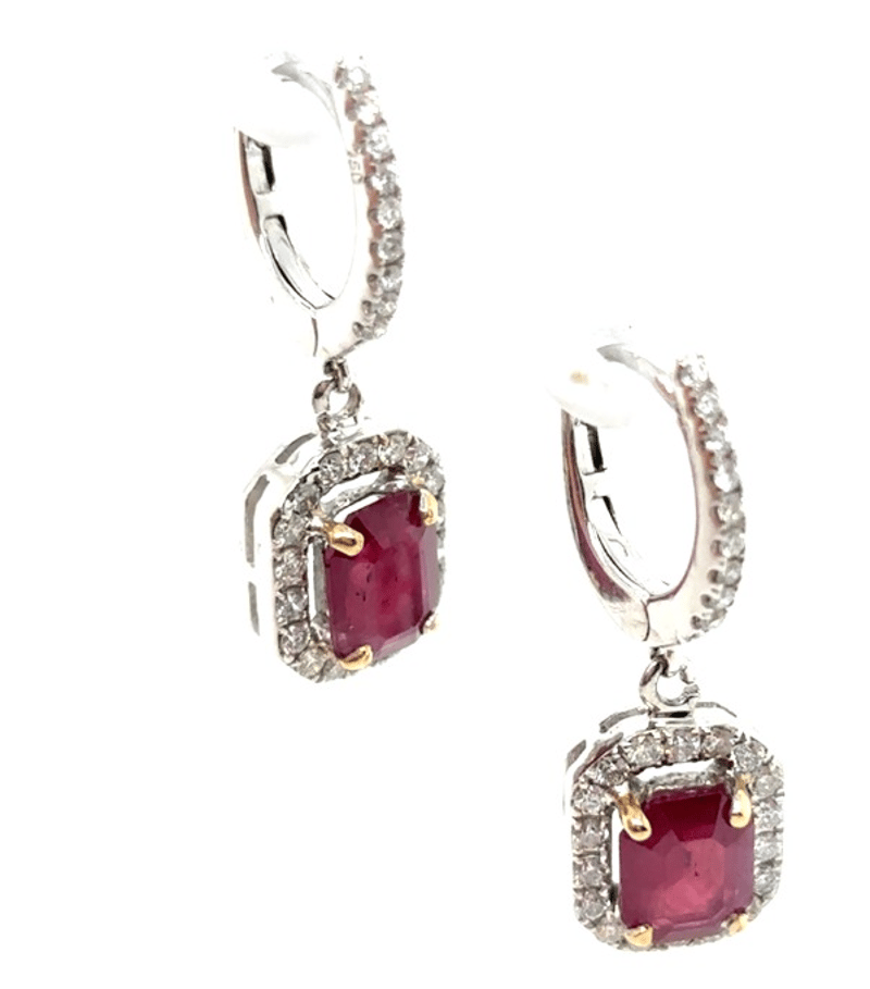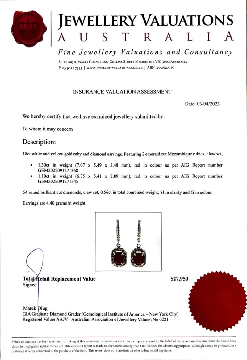Featuring 2 Emerald Cut Mozambique Rubies, Claw Set, • 1.30Ct In Weight (7.07 X 5.49 X 3.48 Mm), Red In Colour As Per Aig Report Number Gem2022091271368 1.10Ct In Weight (6.75 X 5.41 X 2.89 Mm), Red In Colour As Per Aig Report Number Gem2022091271345 54 Round Brilliant Cut Diamonds, Claw Set, 0.56Ct In Total Combined Weight, Si In Clarity And G In Colour. Earrings Are 4.40 Grams In Weight