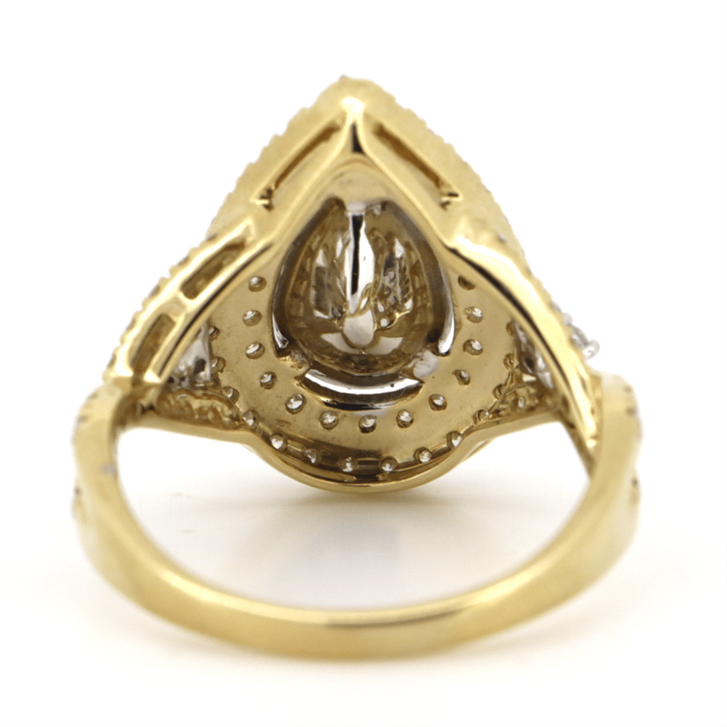 14K YELLOW/WHITE GOLD AND DIAMOND, DOUBLE HALO TWIST BAND RING. The Centre Features, One Pear Modified Brilliant Cut, Diamond (2.01Ct, G-H Colour, P2-P3 Clarity), 3 Claw Set. Surrounding The Centre In A Halo Are, 88 Round Brilliant Cut, Diamonds (0.75Ct Tdw, H-K Colour, P2+ Clarity), Bead Set. Ring Size M 1/2. Valuations Provided by an Independent Third-Party Professional Not Directly Associated With Lloyds Auctions at AUD $$57,300.00This valuation has been conducted by an independent third-party professional. The valuation amount is an assessment by the issuing valuer and does not reflect the auction value of the item. Any inquiries regarding the valuation should be directed to the issuing valuer (refer to contact details on the certificate), as Lloyds Auctions has no affiliation or influence over the valuation, the valuer, or the stated amount. Condition: Good - Refer Images 0645844+5091