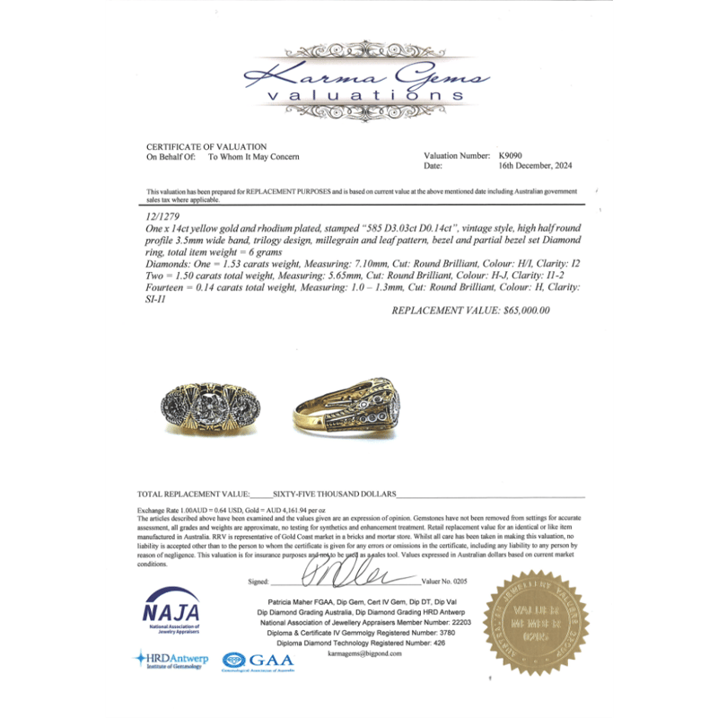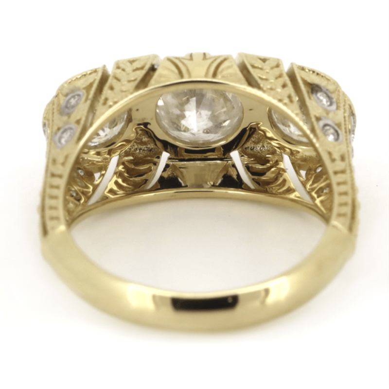The Centre Features, One Round Brilliant Cut, Diamond (1.53Ct, H-I Colour, I2 Clarity), Bezel Set With Millegrain Detail. Flanked By, 2 Round Brilliant Cut, Diamonds (1.50Ct Tdw, H-J Colour, I1-I2 Clarity), Bezel Set With Millegrain Detail. Decorating The Band Are, 14 Round Brilliant Cut, Diamonds (0.14Ct Tdw, H Colour, Si-I1 Clarity), Bezel Set. Ring Size P 1/2.