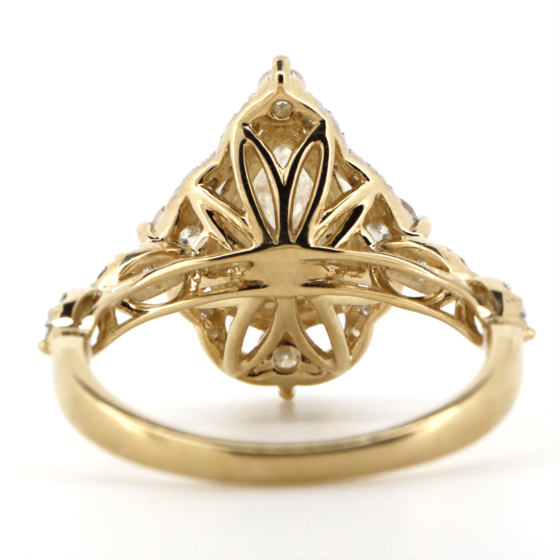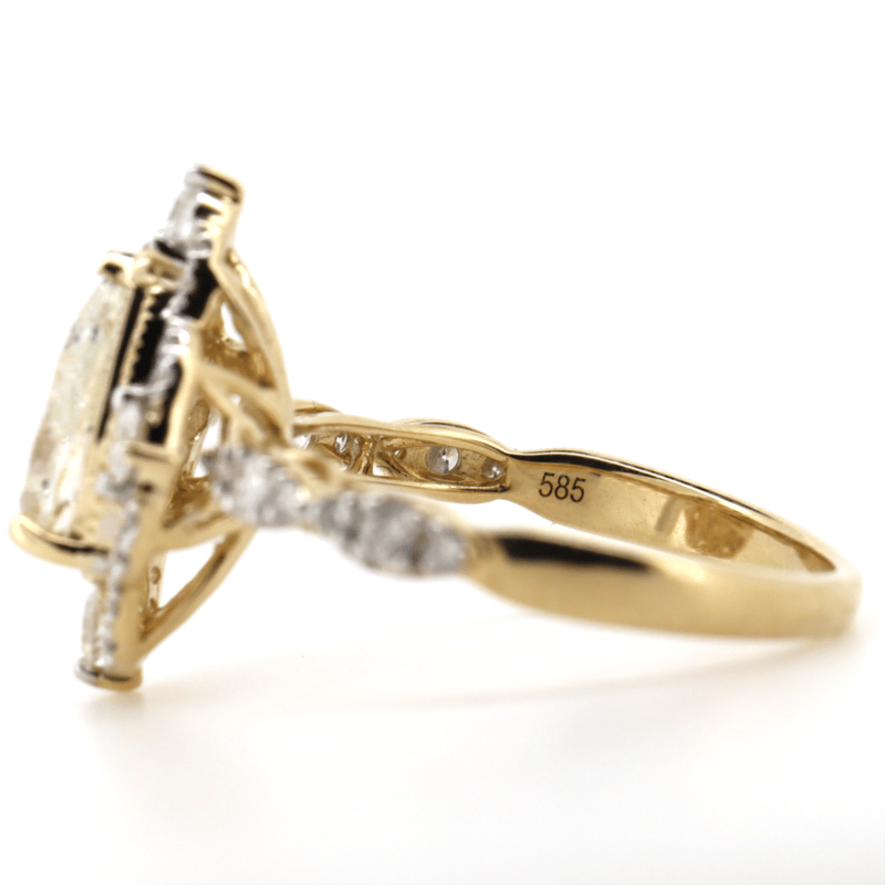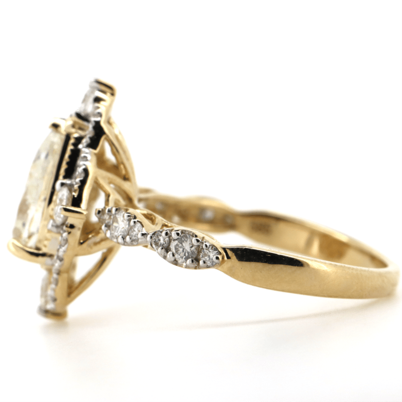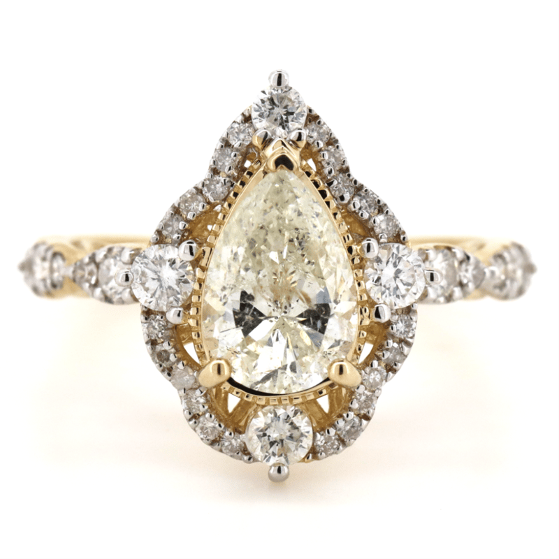 The Centres Features, One Pear Modified Brilliant Cut, Diamond (1.50Ct, J-K Colour, P2 Clarity), Bead Set. Accompanying The Centre Are, 38 Round Brilliant Cut, Diamonds (0.58Ct Tdw, G-H Colour, Si1-Si2 Clarity), Bead Set. Ring Size O.